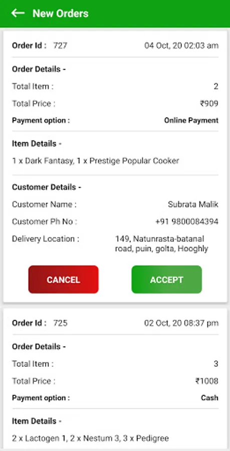 New Order: Wheneve an new order will place by customer you will find the details of the new order here.