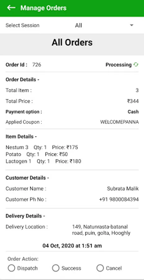 Manage Order: Here store can manage and view order status that is if an order is processing , dispatched or successfully delivered. Ordered items details, price, customer details and delivery location will be shown here.
