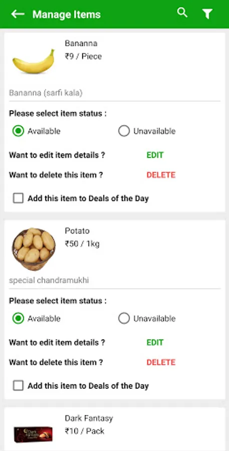 Manage Items: In this section store can add new item and edit or delete existing item details.