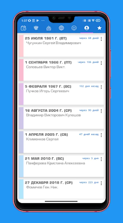 Birthdays: The application automatically syncs with your contact list and allows you to never miss the birthdays of your friends, family and colleagues. You will receive notifications in advance so that you have time to prepare and send congratulations.