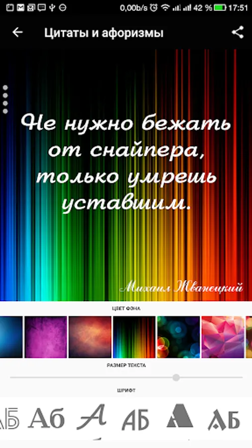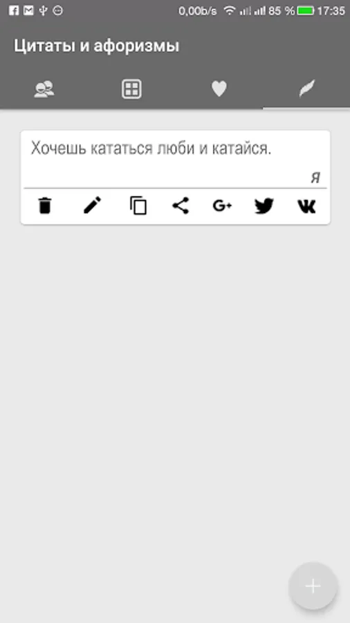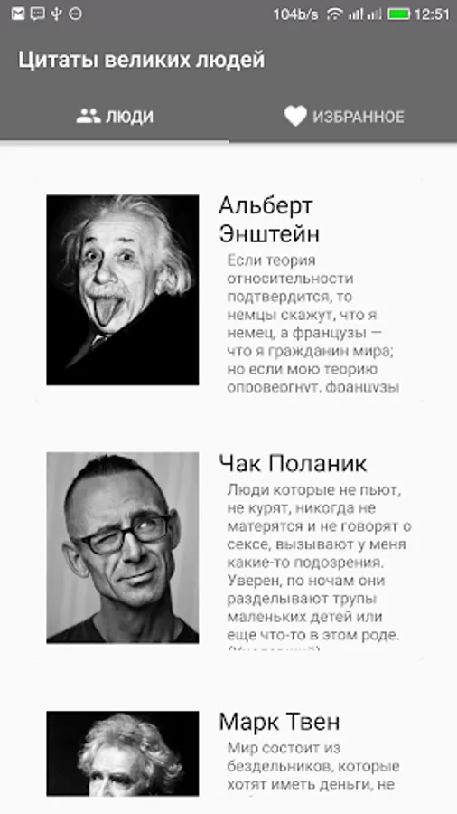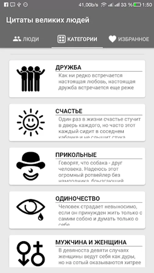 Our collection of quotes and aphorisms is designed for people who are interested, not only watch videos and photos, but also read and think. Our collection contains quotes, aphorisms and thoughts of writers, actors, ancient thinkers, philosophers, humorists, politicians, generals. Also quotes and aphorisms are grouped into categories. In our application you can find a quote or author by keyword. You can easily share the quote with friends on social networks or add to favorites in order to read the quote later. In the collection of quotes and aphorisms, you can quickly create a beautiful post and publish it on your blog or on the social network page. Also in our application you can add your thoughts, who knows, maybe you will be quoted by future generations.