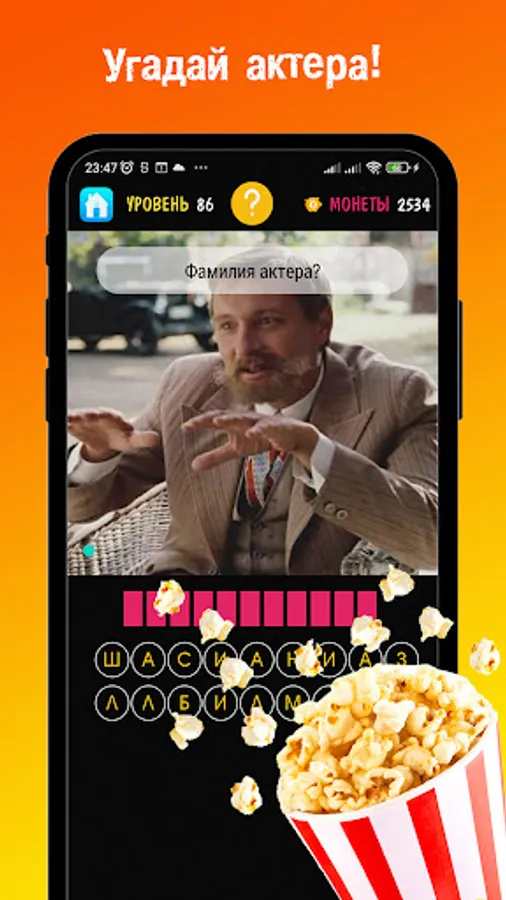 To keep the Our Movies quiz from being too easy, the photo is initially blurry. You can reduce the blur by moving the slider at the bottom of the photo, but coins will be deducted, removing the blur completely costs 100 coins, but don't let that bother you, if you run out of coins, you can always replenish them by watching a short video or sharing a link to the game on social networks . If you can't guess which movie frame or who is in the photo, use hints; open a letter, remove the extra ones or skip the level.