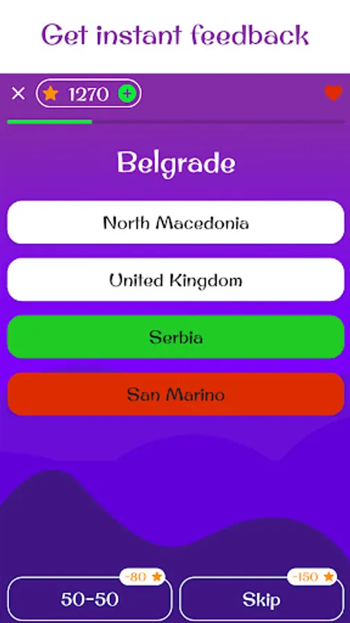 • Multi-choice questions with 3 lives: Play the capital or the country modes