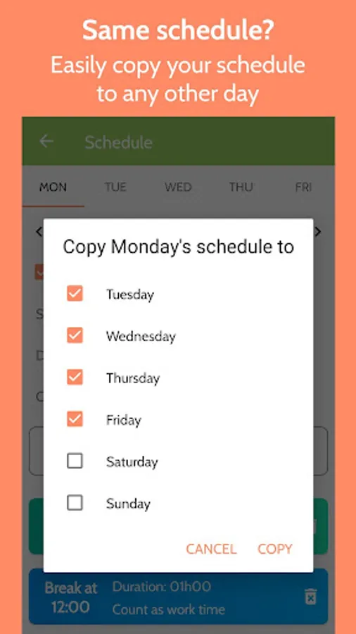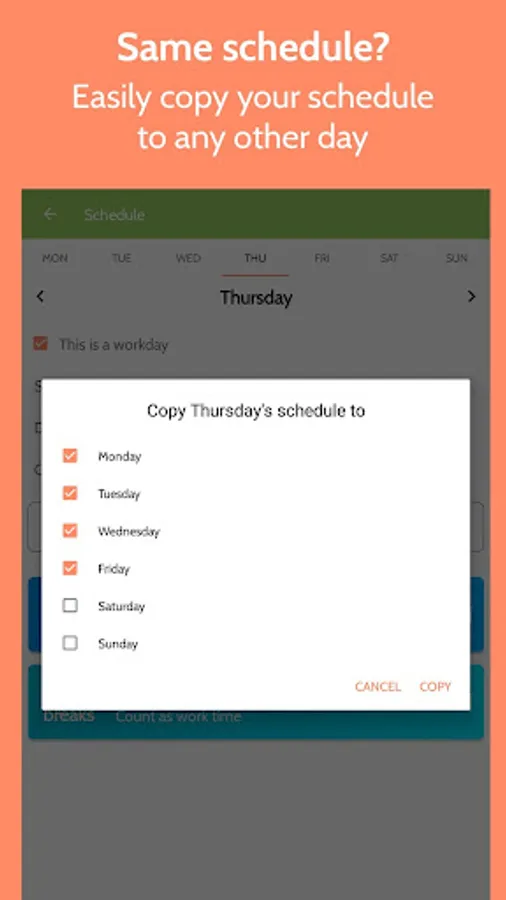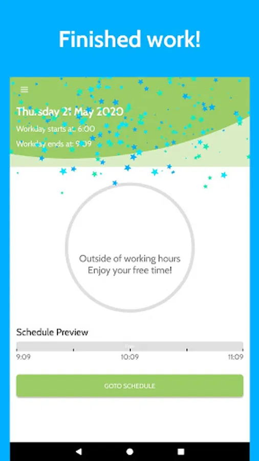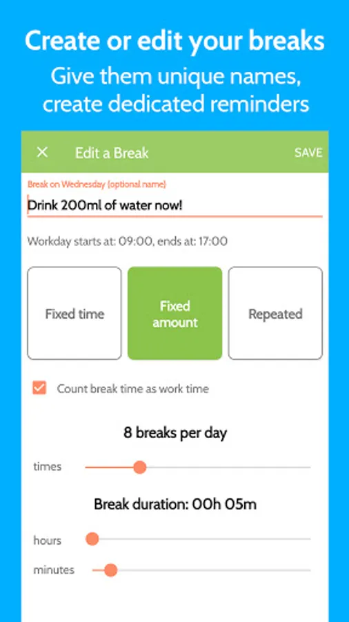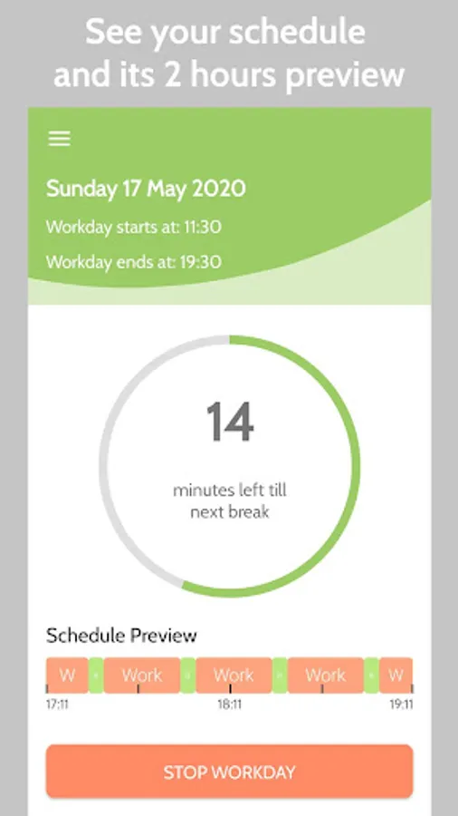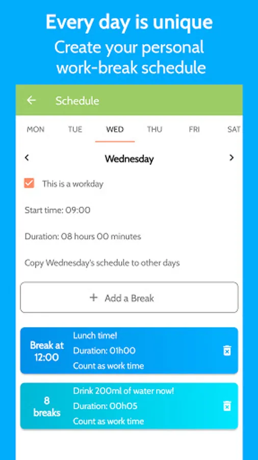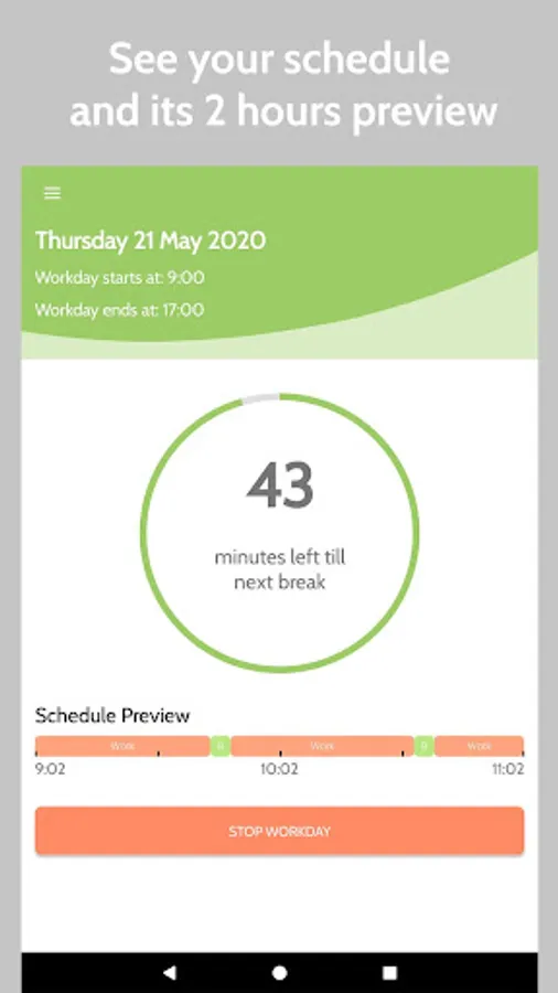 Work Break app is an easy and simple solution to schedule your breaks with personalized reminders and be reminded when to rest during a workday. Keep your body and mind healthy by taking time to stand up, move, stretch, drink or eat.