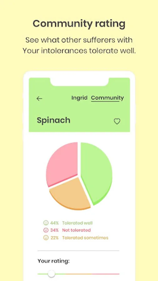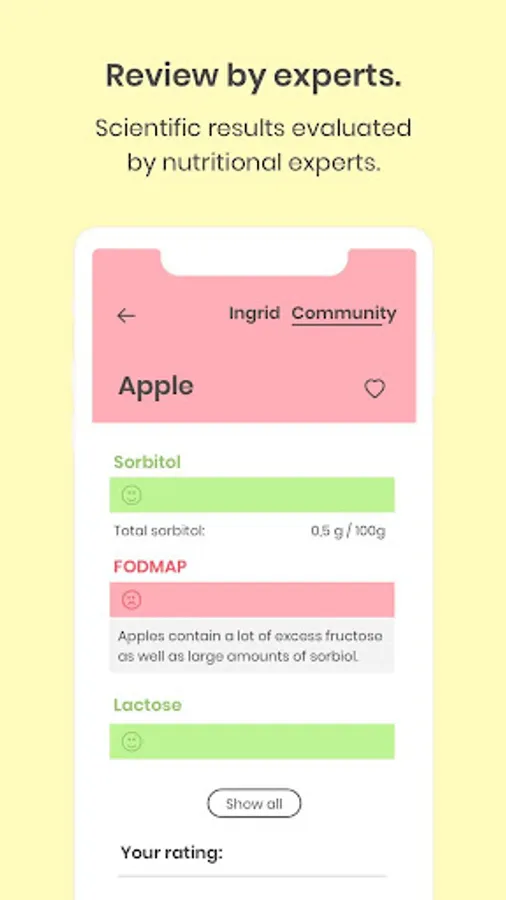 Download the free app and adjust your personal intolerances. Ingrid shows you all the important information. The information is based on scientific findings and the food ratings are developed in collaboration with the experts of the Austrian charity “Society for Public Health”. Ingrid also shows you how well individual foods are tolerated by other people. So the community results let you see, how other patients tolerated that foods.