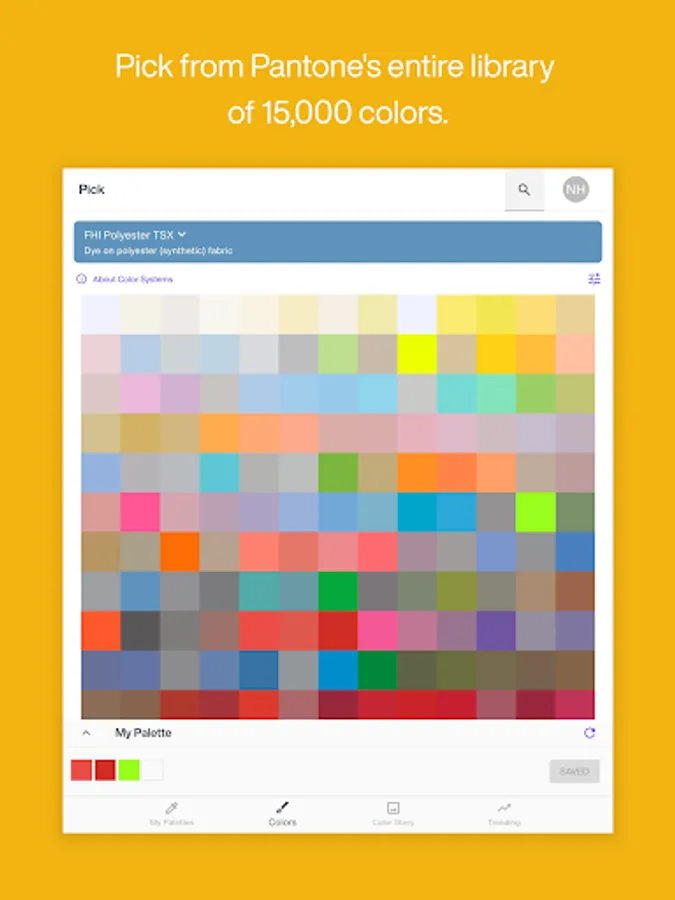 • Pick – Select your desired colors for a given project and see Pantone Reference Numbers for each color selected.