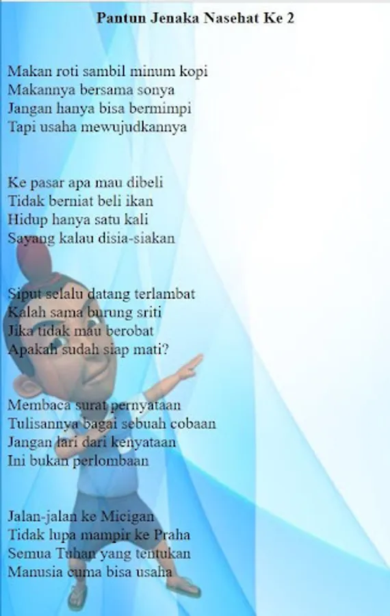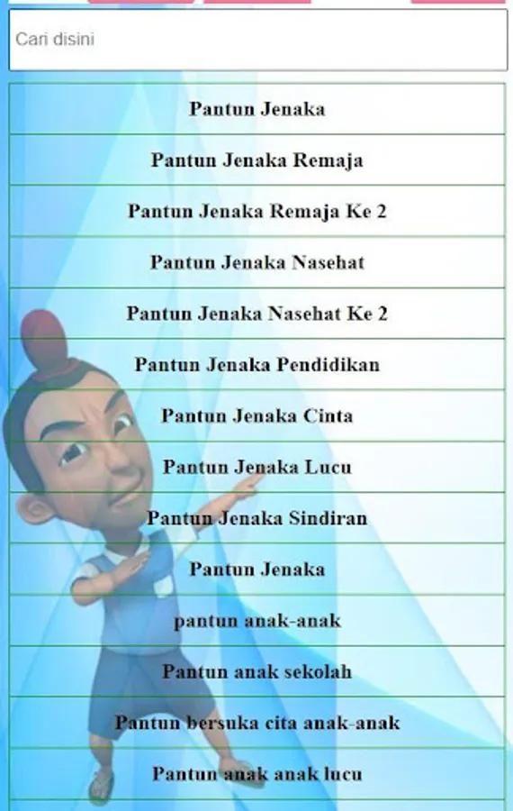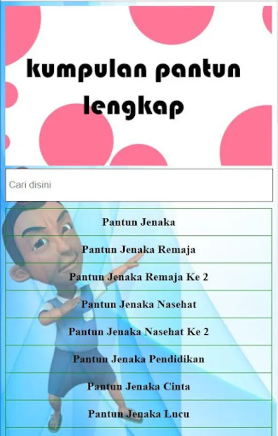 This application is made with the best design or appearance to make it easier for users. The application of this most comprehensive pantun consists of thousands of pantun in it, grouped in thousands of pantun categories.