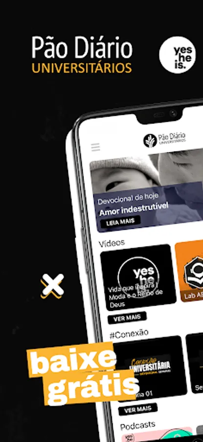 At Pão Diário Universitários you have free access to the devotional Pão Diário, to the weekly studies of the University Connection, reading plans, podcasts, videos, online courses and web radio, in addition to articles and special videos from our partners, such as Rede Universitária, Associação Brazilian Society of Christians in Science, School of the Disciple, YesHeIs, Bible Project, Aliança de Pequenos and One Ministério.