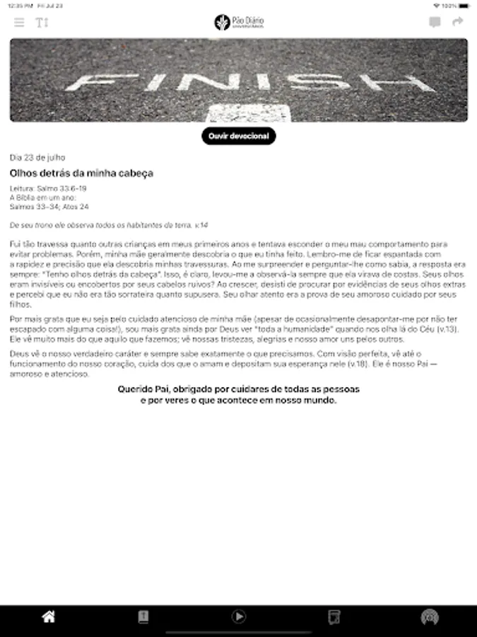 When accessing the devotional of the day, in addition to the reflection, you will find the biblical passage and the key verse of the text. After finishing the devotional, you can still interact with other professionals in the comments and share the reflection with your colleagues, friends and family.