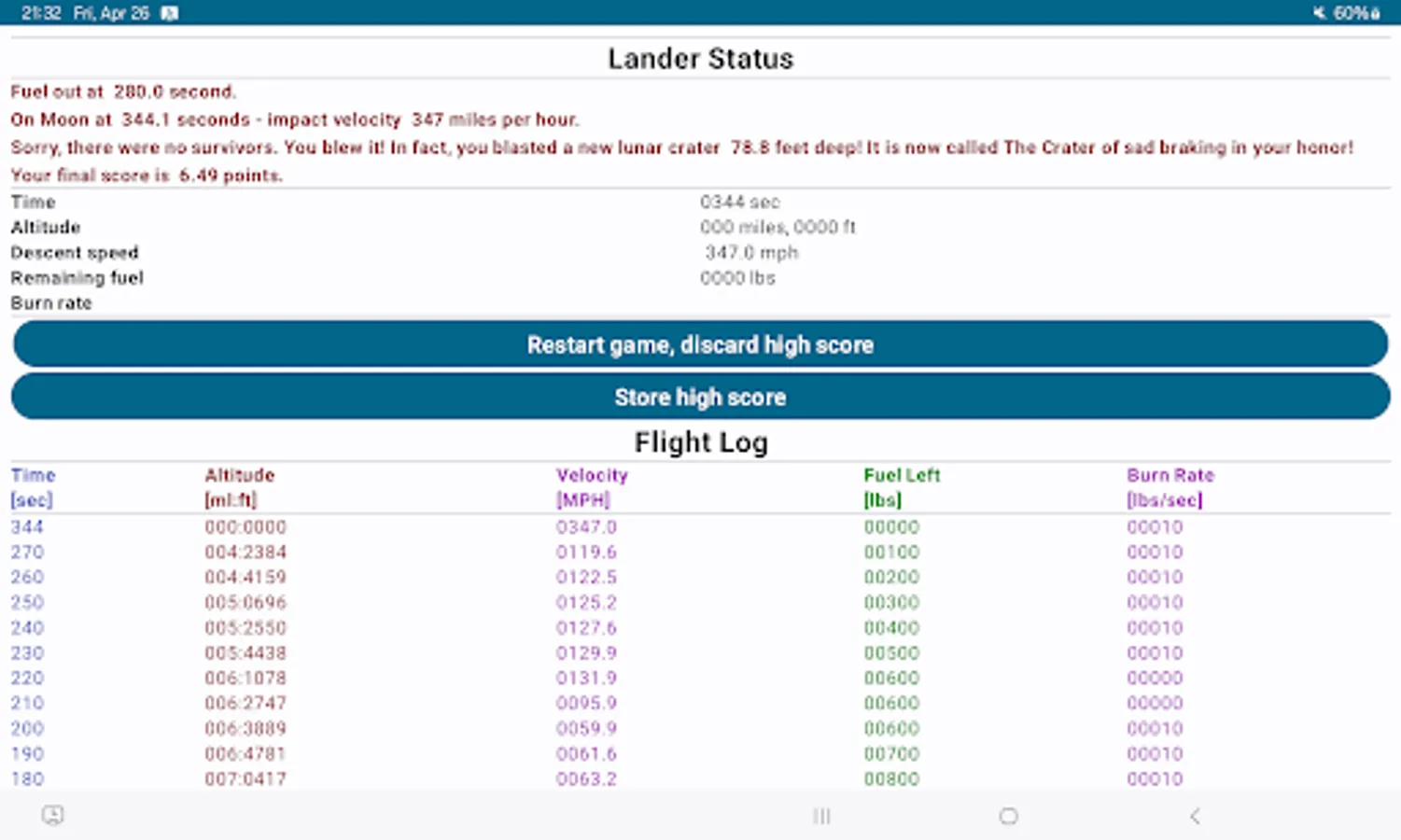 Are you able to land safely with the Lunar lander module and save the crew? Will you have enough fuel to do so? Or will your attempt end in creation of a new crater on Moon with some apt name?
