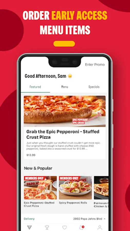 Get great offers & deals on delivery from your neighborhood Papa Johns Restaurant. Craving a tasty slice of pizza? Turn on push notifications to make sure you never miss an online offer for your next mobile food order and pizza delivery.