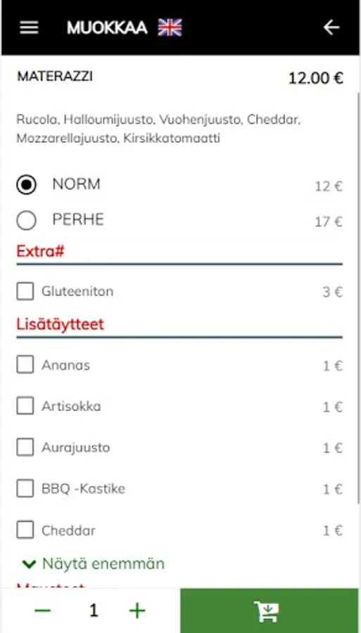 Valittuasi halutun ruoka-annoksen, lisäät sen ostoskoriin – tai valitset esim. lisätäytteitä. Voit tehdä vielä