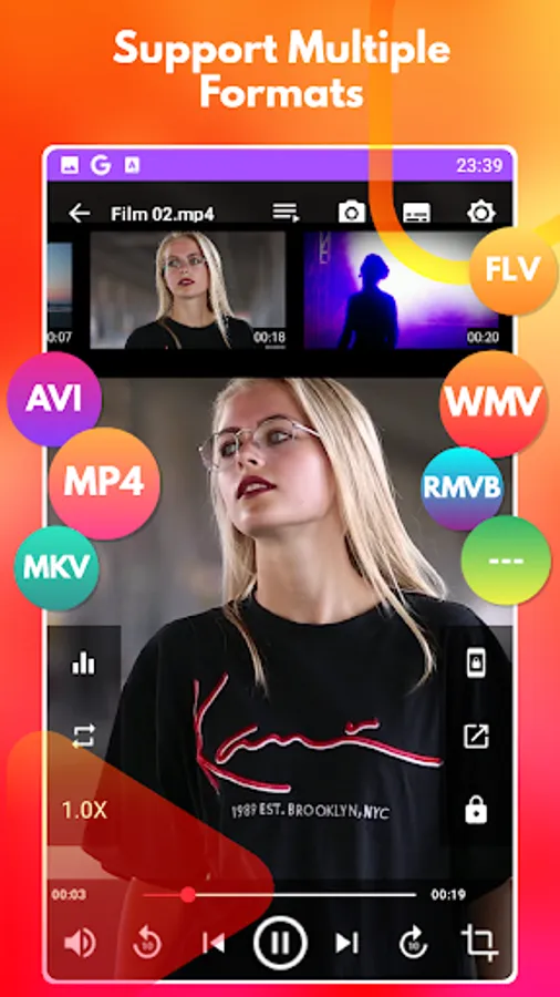 Play all movie and video formats like AVI, M4V, MP4, WMV, FLV, MPEG, MPG, MOV, RM, VOB, ASF, MKV, F4V, TS, TP, M3U, m3u88 with highest quality.