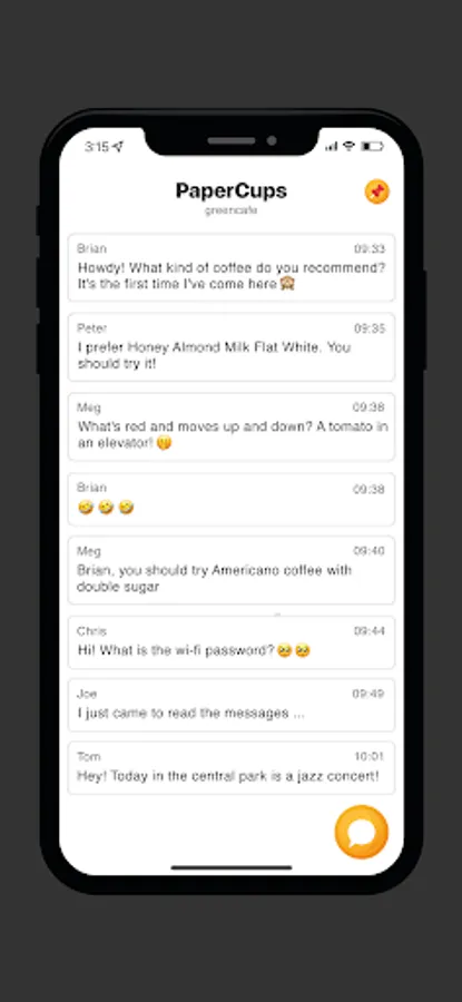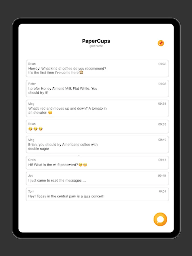Chat with those around you and be updated with the latest events. From the best thing on the menu to the funniest joke or just a stranger saying hello, you are four digits away. Enter the code of your location and enjoy!