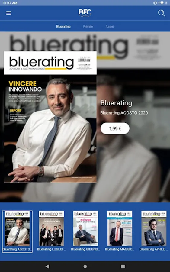 Blue Financial Communication is a media & digital company, specializing in information on personal business and financial products. The company, founded in 1995 and listed on the AIM Italia market of the Italian Stock Exchange since 11 December 2015, publishes BLUERATING, PRIVATE, FORBES ITALIA and ASSET CLASS. BLUERATING: strong and established brand in the asset management market embraces both the networks of financial advisors and asset management houses. PRIVATE: the first and only window in Italy entirely dedicated to the world of private banking and the life of the private banker. ASSET CLASS: the monthly is dedicated to the world of Italian and international asset management seen by its protagonists and in the light of the new regulatory and market challenges.