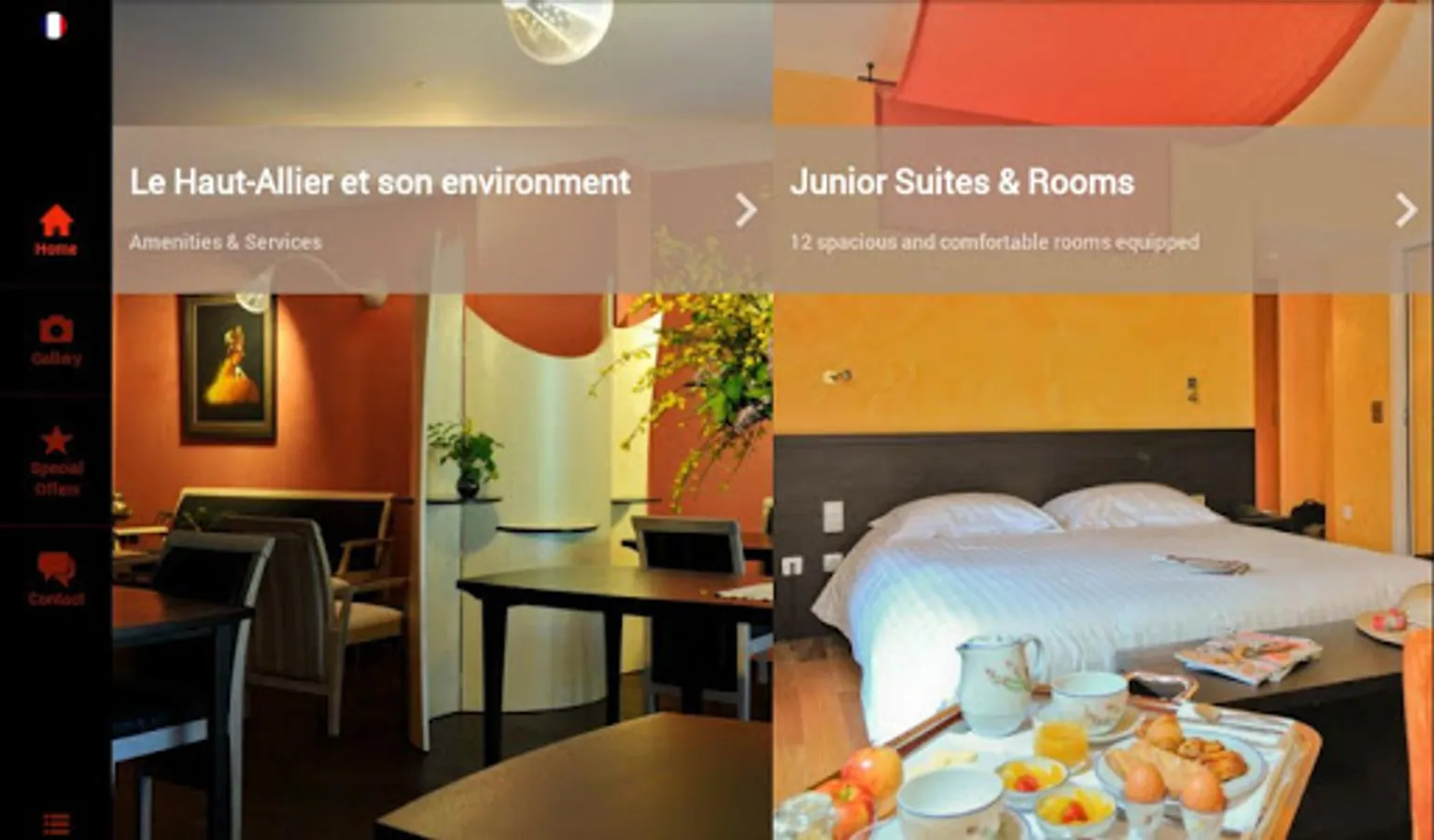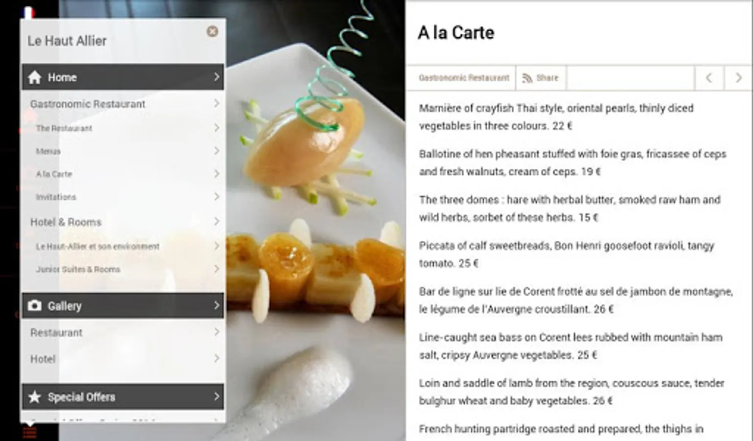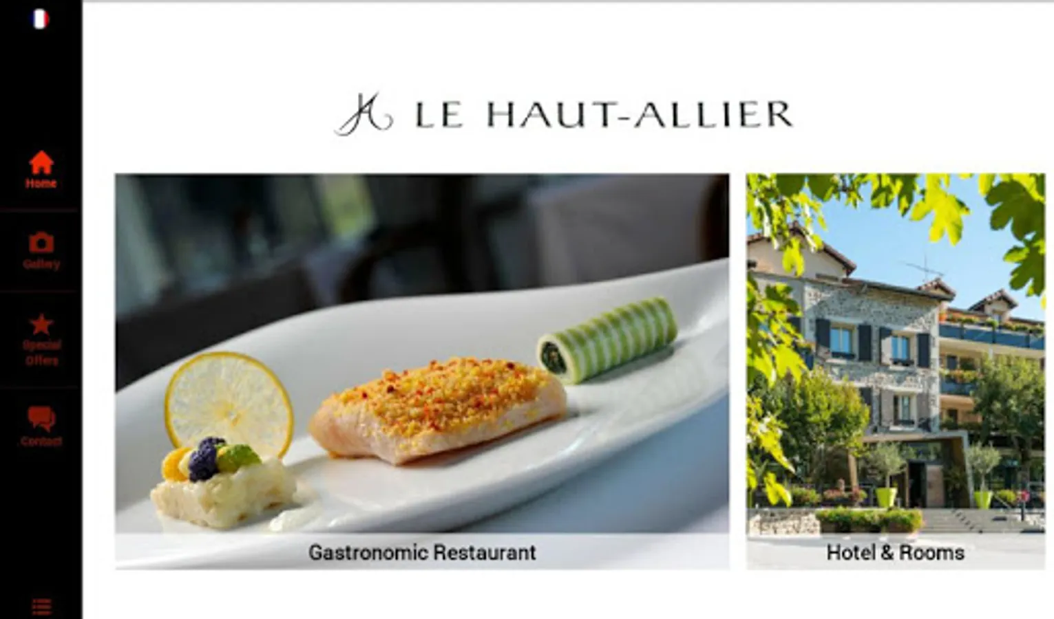 Le Haut-Allier, comfortable hotel and the gastronomic restaurant « Philippe Brun » invites you to a gourmet escapade in Alleyras (25 minutes form Puy-en-Velay) ; Discover menus exemples and book book your stay directly from the application.