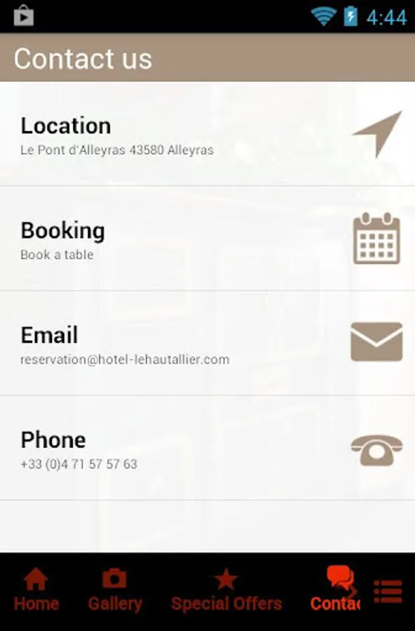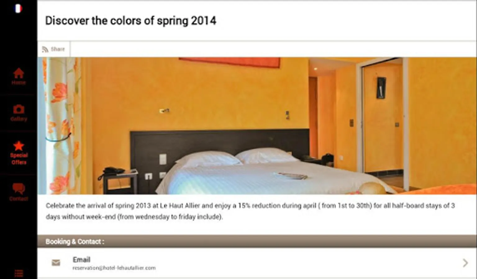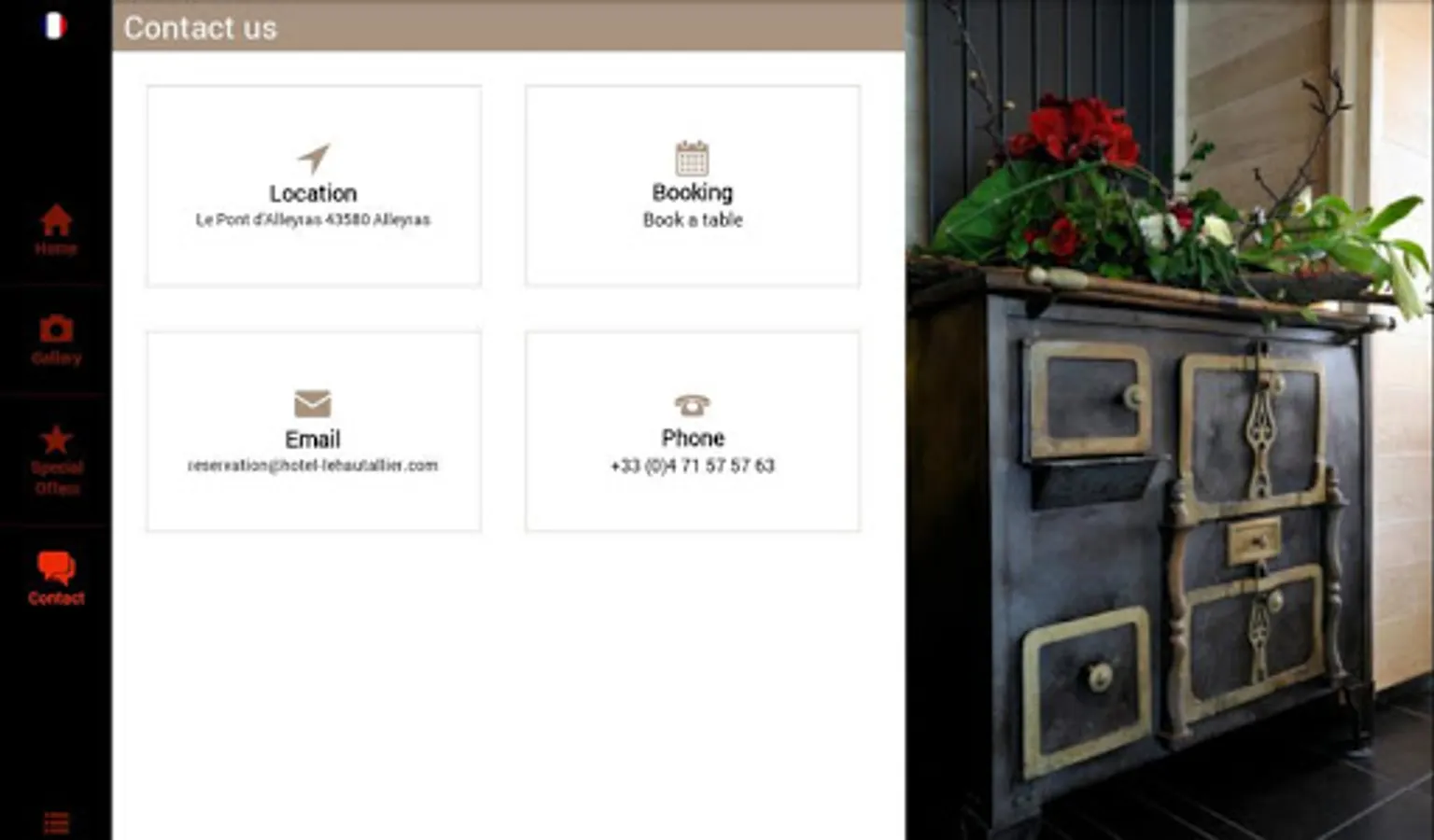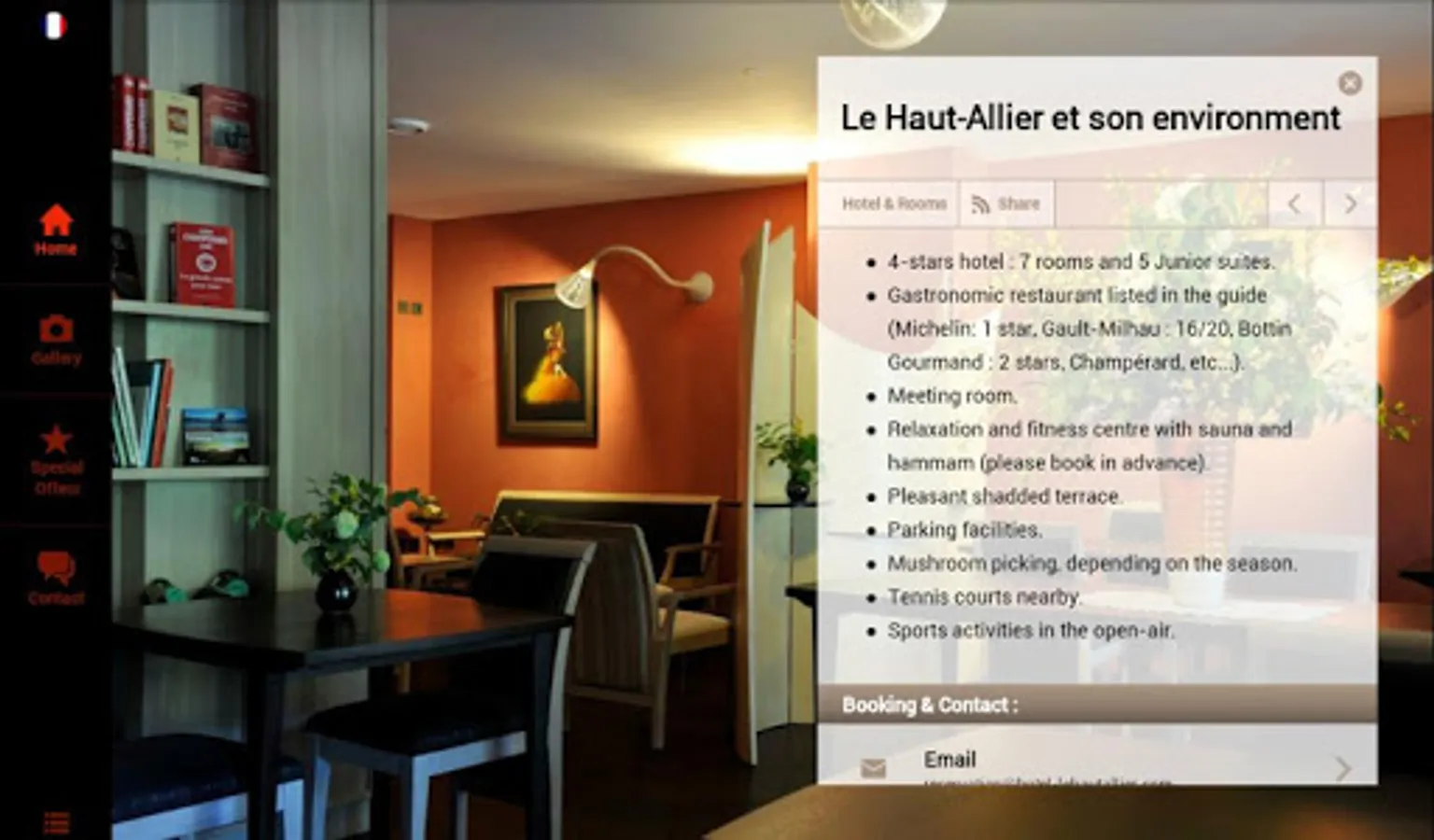 Le Haut-Allier, comfortable hotel and the gastronomic restaurant « Philippe Brun » invites you to a gourmet escapade in Alleyras (25 minutes form Puy-en-Velay) ; Discover menus exemples and book book your stay directly from the application.