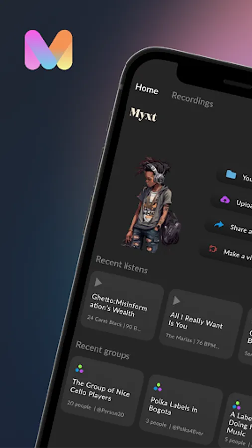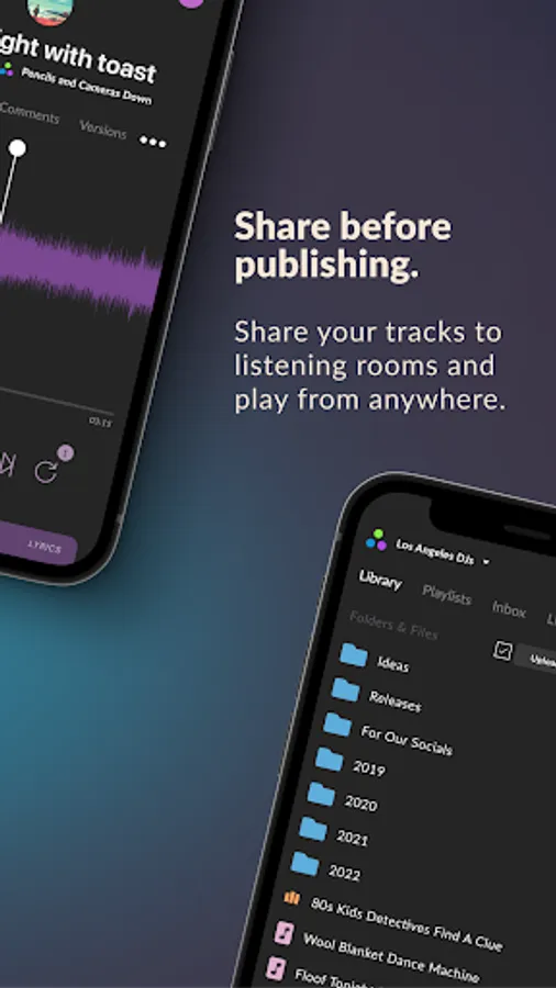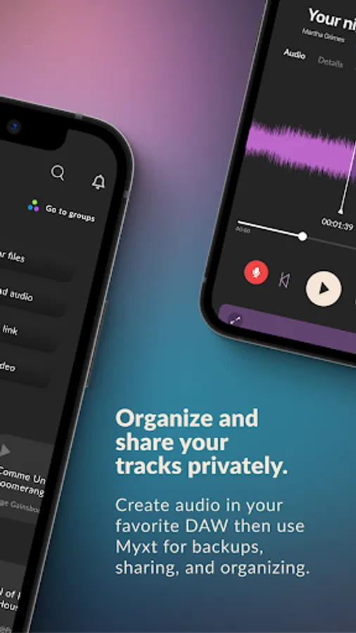 Create audio in your favorite DAW then use Myxt for backups, sharing, and organizing. Web and mobile apps available. Listen to your work everywhere, easily.