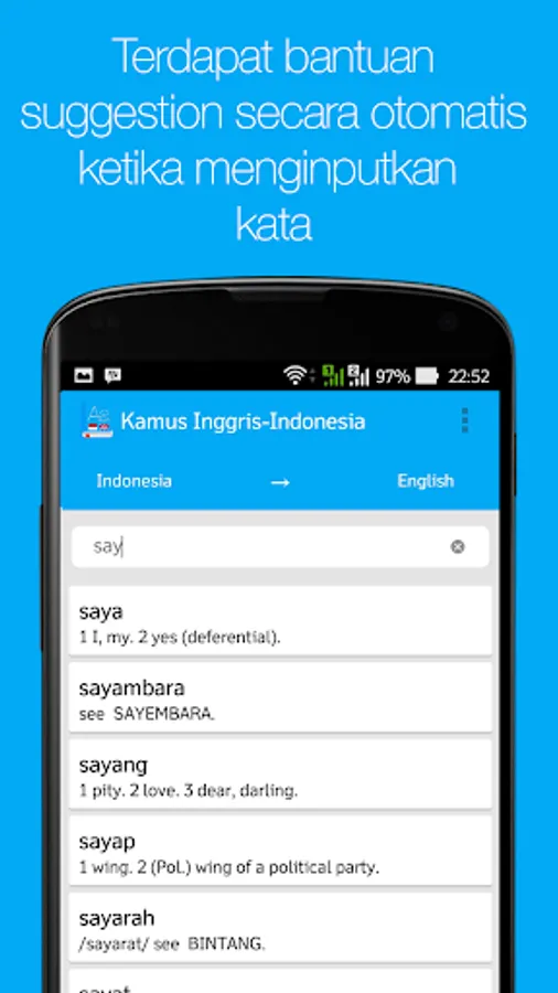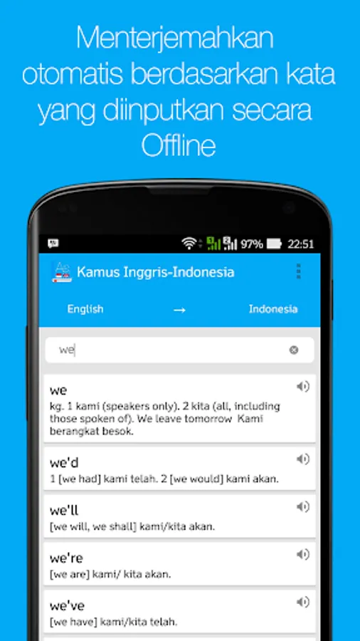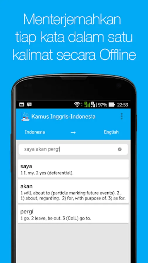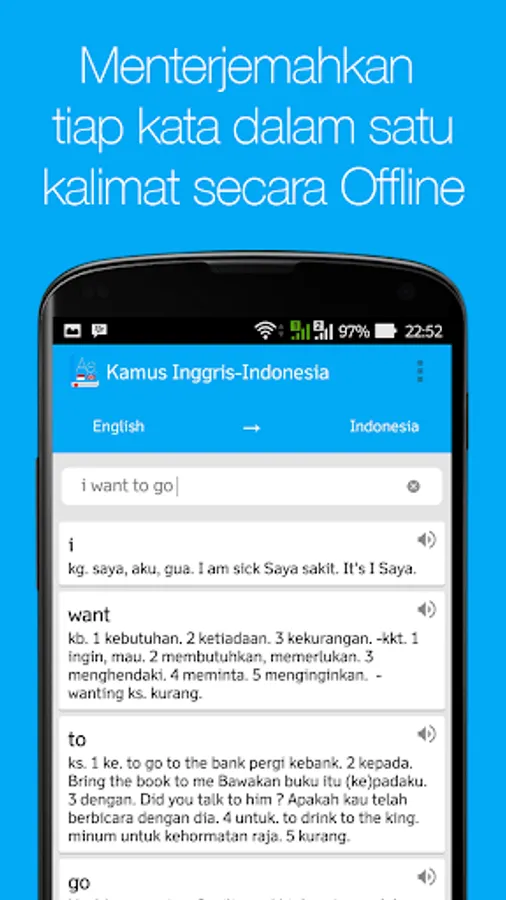 Aplikasi Kamus Inggris - Indonesia (Offline) adalah aplikasi kamus lengkap bahasa Inggris ke Indonesia maupun bahasa Indonesia ke bahasa Inggris. Aplikasi kamus ini dilengkapi dengan data translasi yang sangat banyak meliputi kata benda, kata sifat, verb, irregular verb, dan sebagainya. Dengan tampilan yang mudah digunakan selayaknya buku kamus lengkap yang bisa dibawa kemana mana.