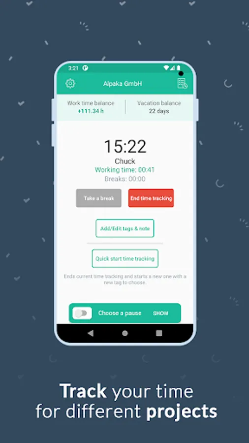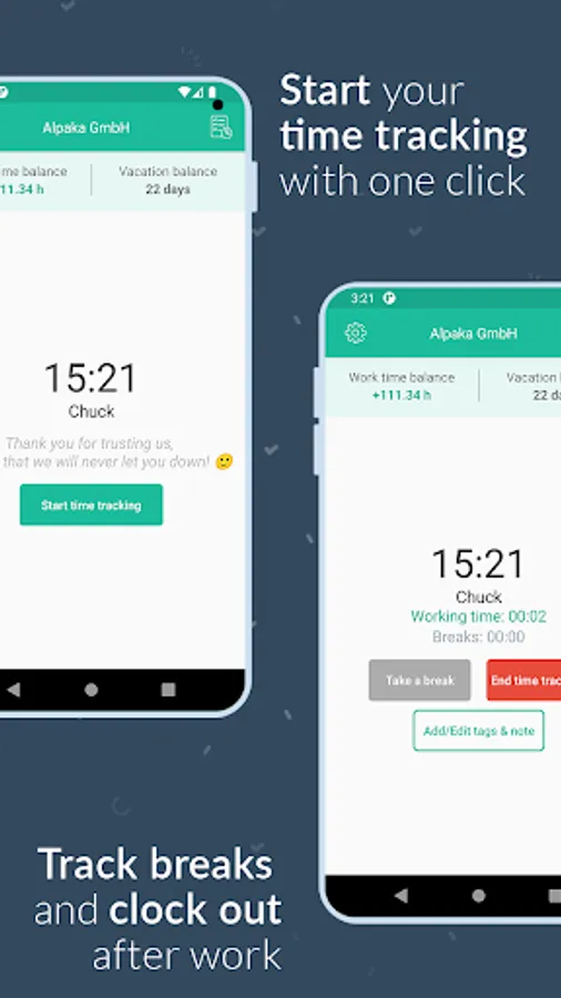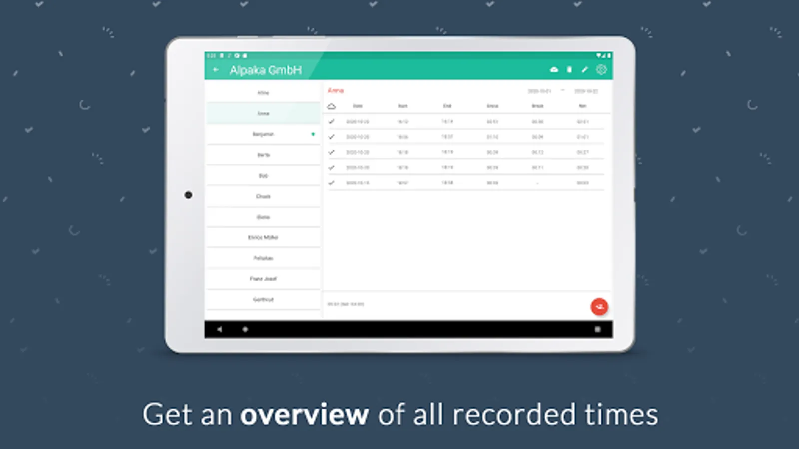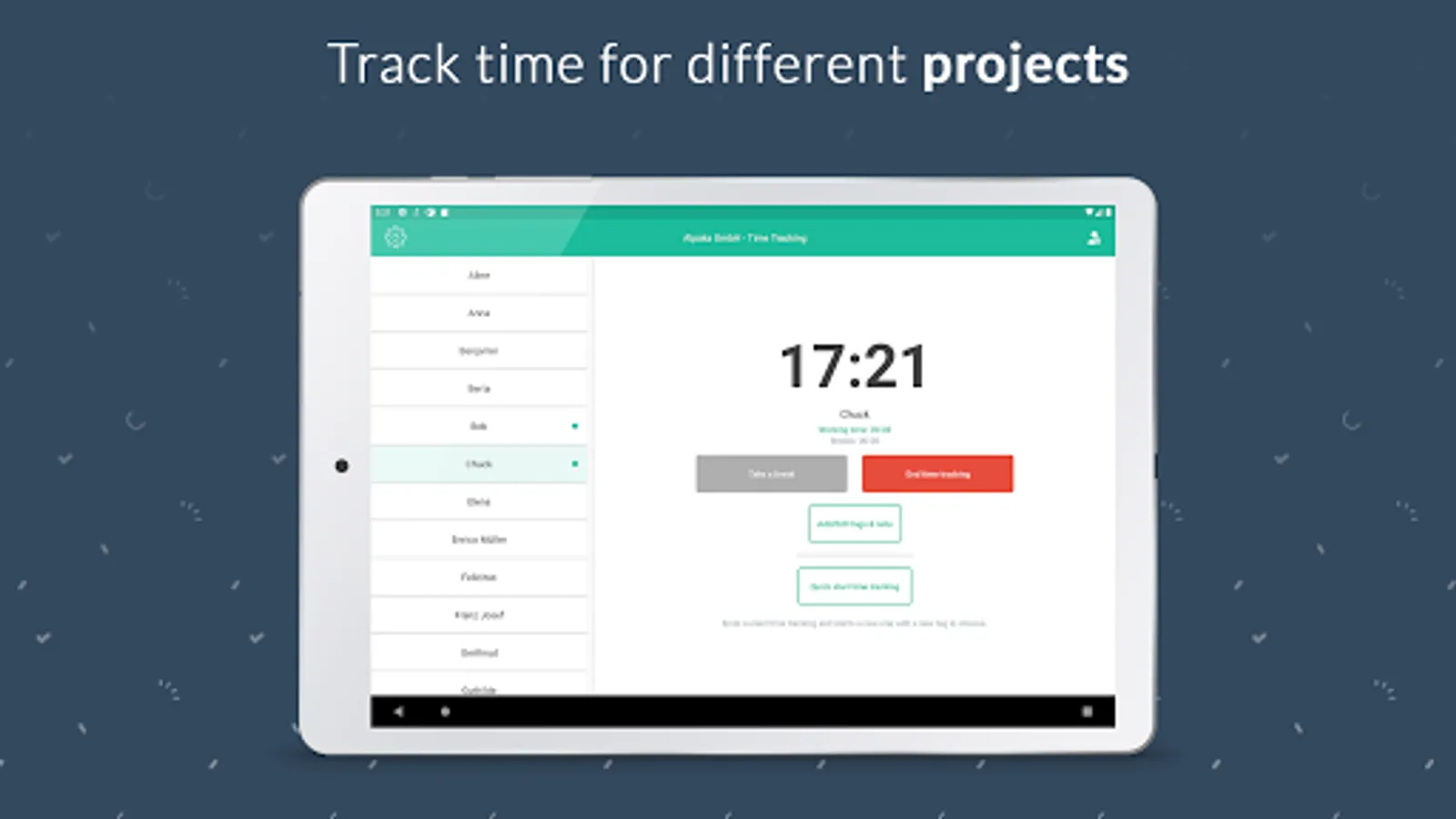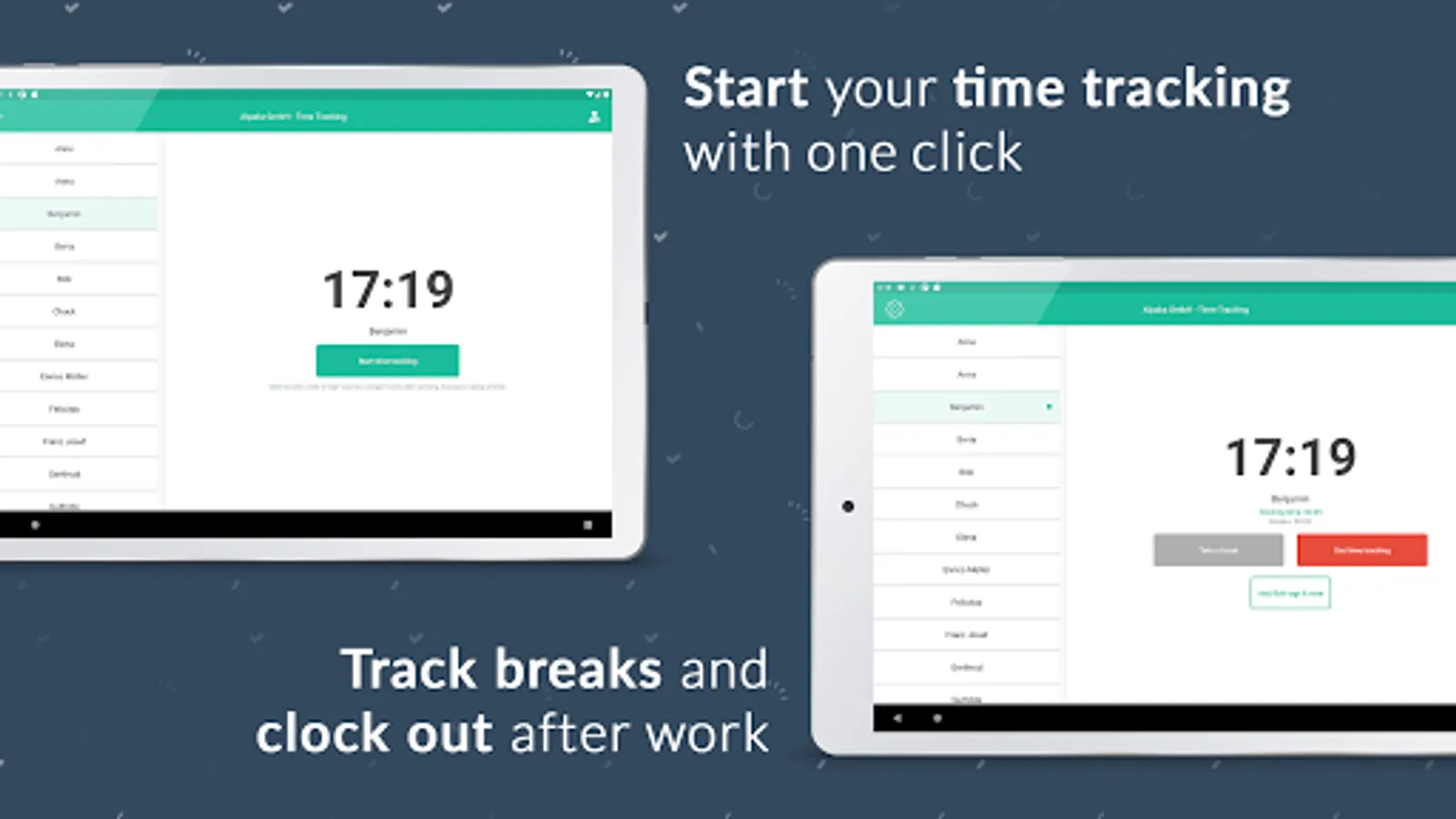 With an Admin Account you can set up a stationary time tracking device for several employees. For example, a tablet at a central location where employees can clock in, clock out and take a break. Automatic breaks or tags can also be taken into account.