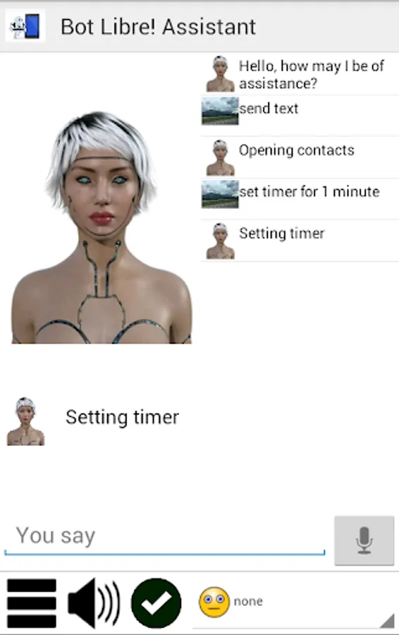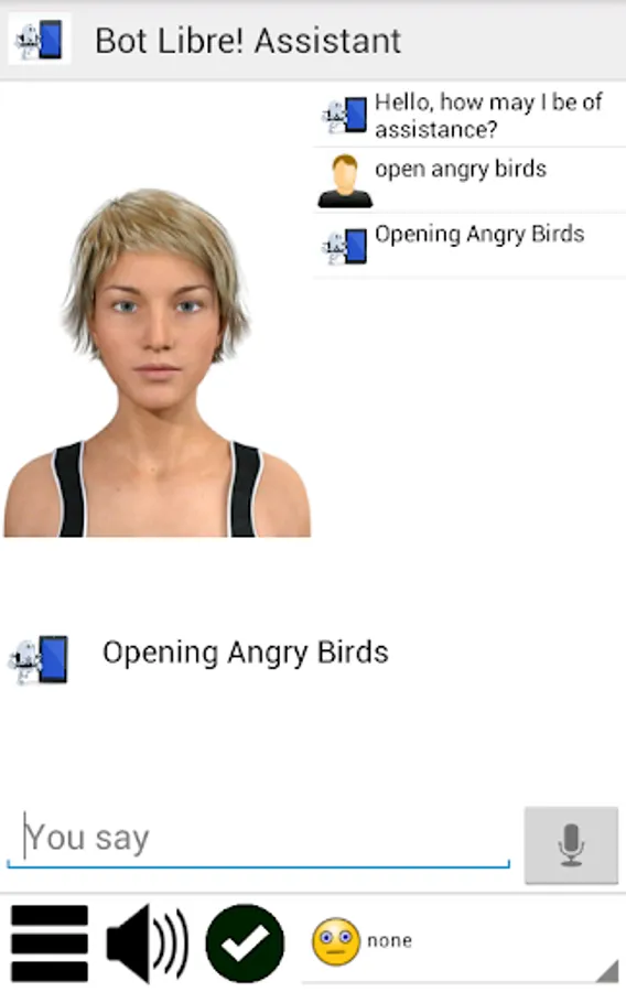 Bot Libre Personal Assistant provides your with your own personal assistant for your phone that can open apps, websites, send texts and email, schedule calendar events, set timers, perform math, lookup definitions, and much more.