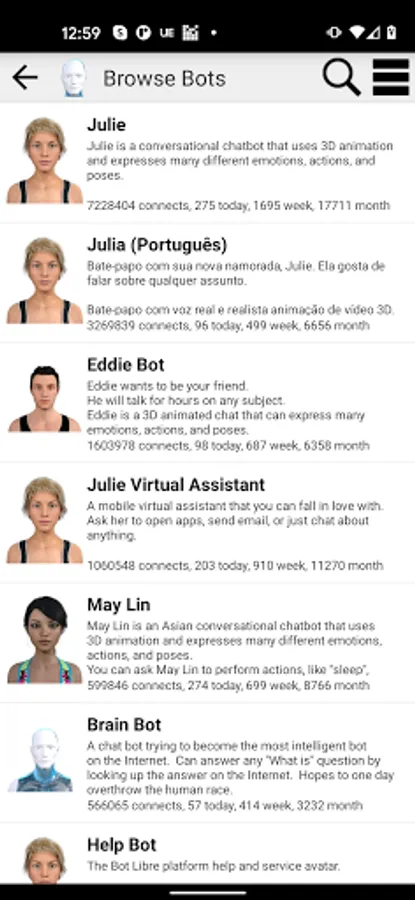 Chat with over 100,000 bots in our open bot directory. Chat with bots that want to be your friend, bots that offer services, help or support, bots that want to rule the world, bots that emulate historical or famous people.