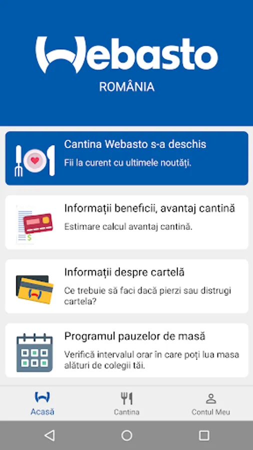 The Webasto Romania application presents the Webasto company and offers an alternative way of communicating and presenting information and news within the company. From information and news related to the day of the open gates, to the menus available in the Webasto canteen, to charitable actions and impact events in the local community, all these can be found in the Webasto Romania application.