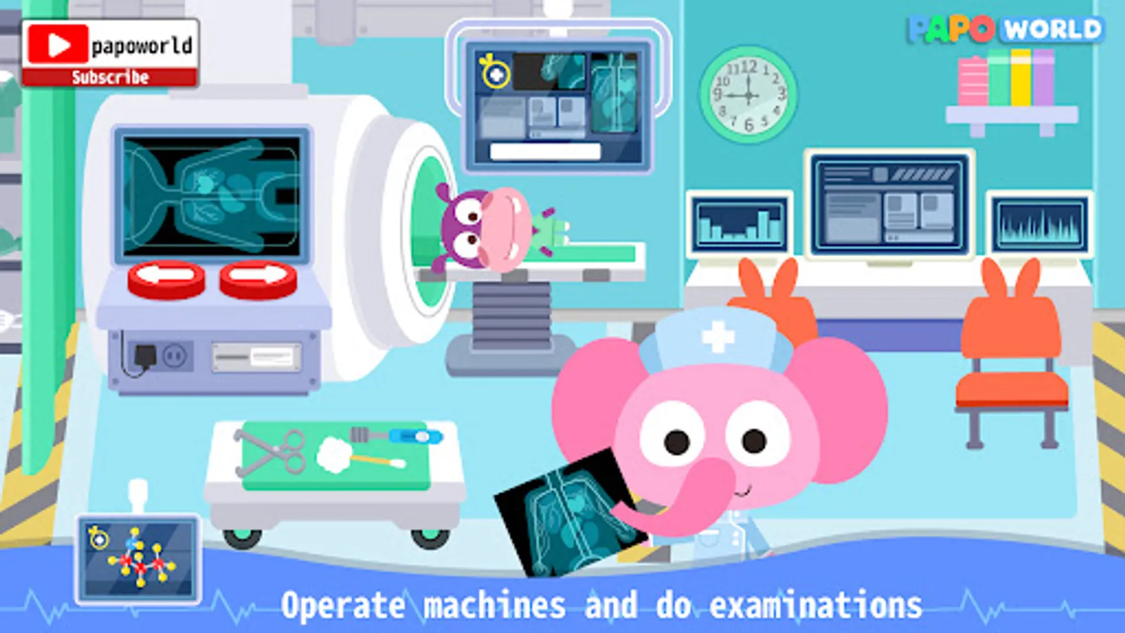 Do you want to be a doctor? Start your internship at the Papo Town Hospital! Work as a doctor to treat the town residents! Do you know how to operate an x-ray machine? How about doing a dental check for Colin the Cat, or work as in the emergency center to cure the patients? Explore in the hospital and become an excellent doctor!