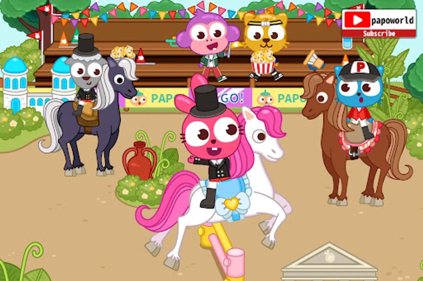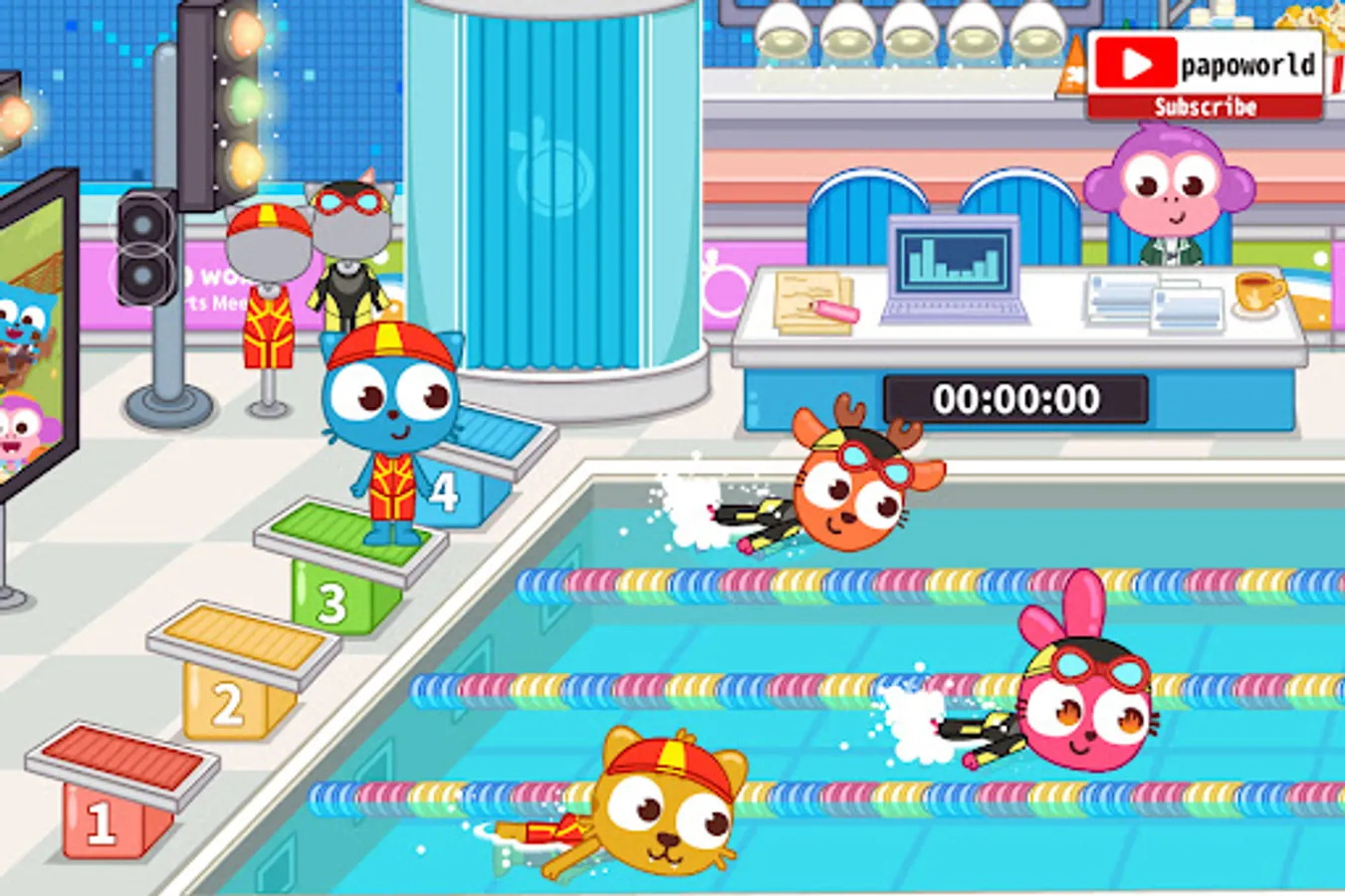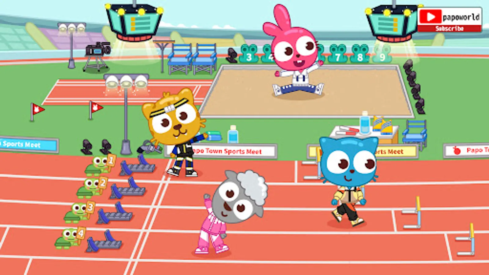 Take a tour at the sports meet stadium for all the events such as track and field, swimming, gymnastics, horse racing and different ball games like football, basketball, baseball and tennis. Practice at the venues and get ready for the real challenge! When you are ready, enter the sports challenge games for a real competition. Play against the Papo Town friends and aim for the gold medal!