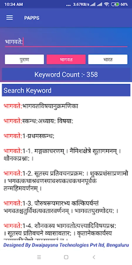 This App helps to search words in the indexes of Puranas and Mahabharata. It is immensely helpful for research scholars of Indian studies, particularly traditional Pandits. This is a pure Sanskrit App as 99.99% of the data is in Sanskrit.