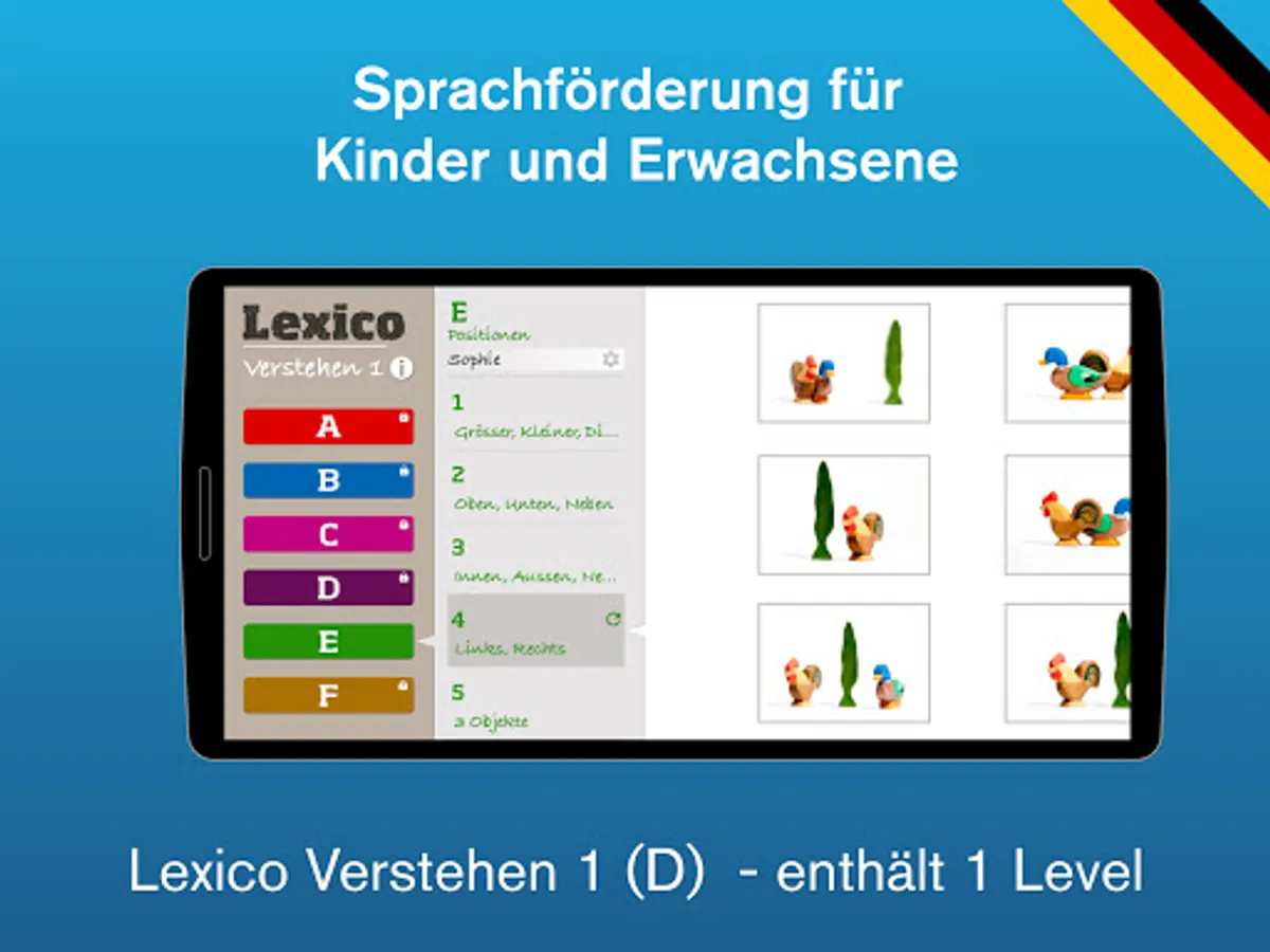 Lexico Understanding 1 was conceived and developed with experienced speech therapy and pedagogy specialists. Lexico Understanding 1 contains level “E”. The other levels can be unlocked with an in-app purchase.