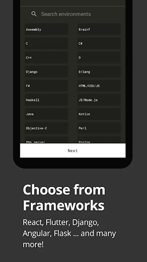 Write a program/code in any of the available 50+ Programming Languages and frameworks.
