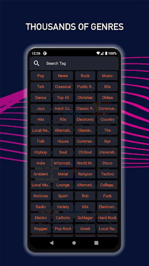 ★ There are thousands of music tags in Radio Mobi: Pop, Rock, Jazz, Classical, Latin, Blues, Rap, Metal, Ethnic, Dance, Country, Chill out and many more... You won't believe in your eyes when you see the tag list. 80000+ stations categorised by more than 6400 tags.