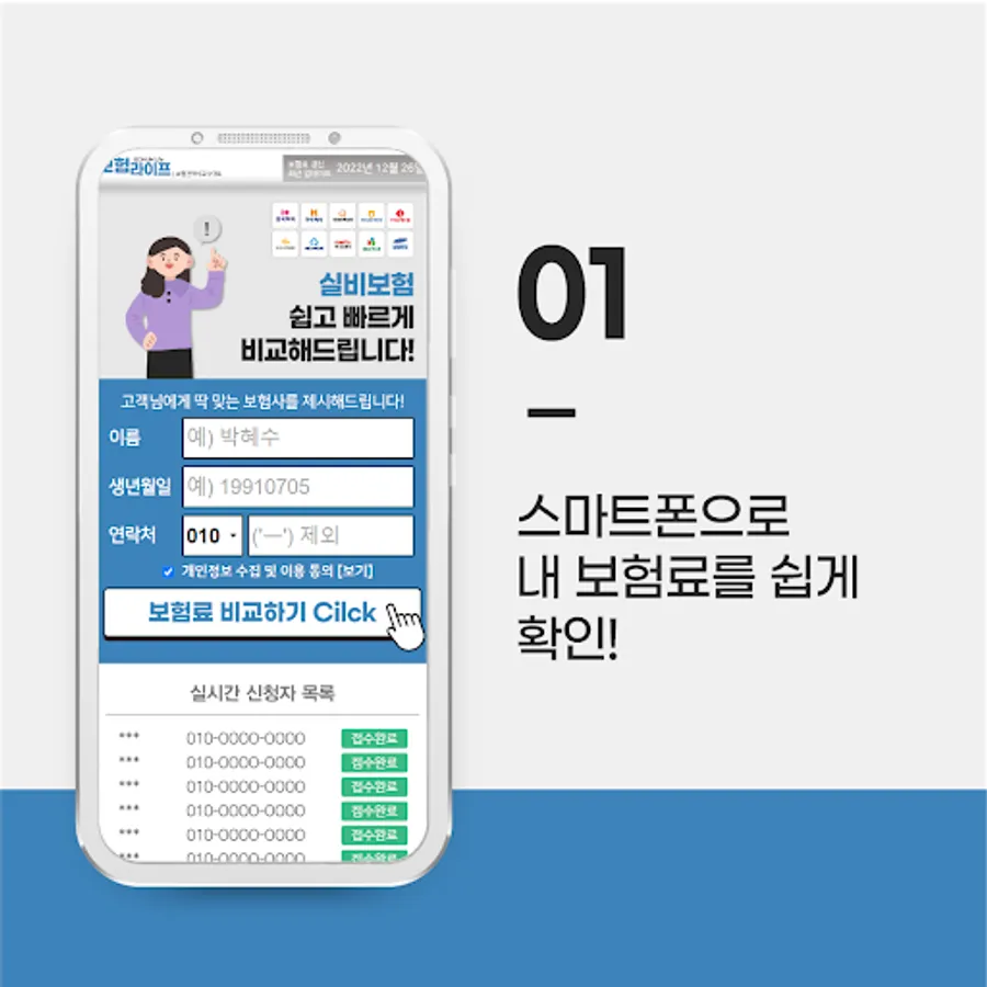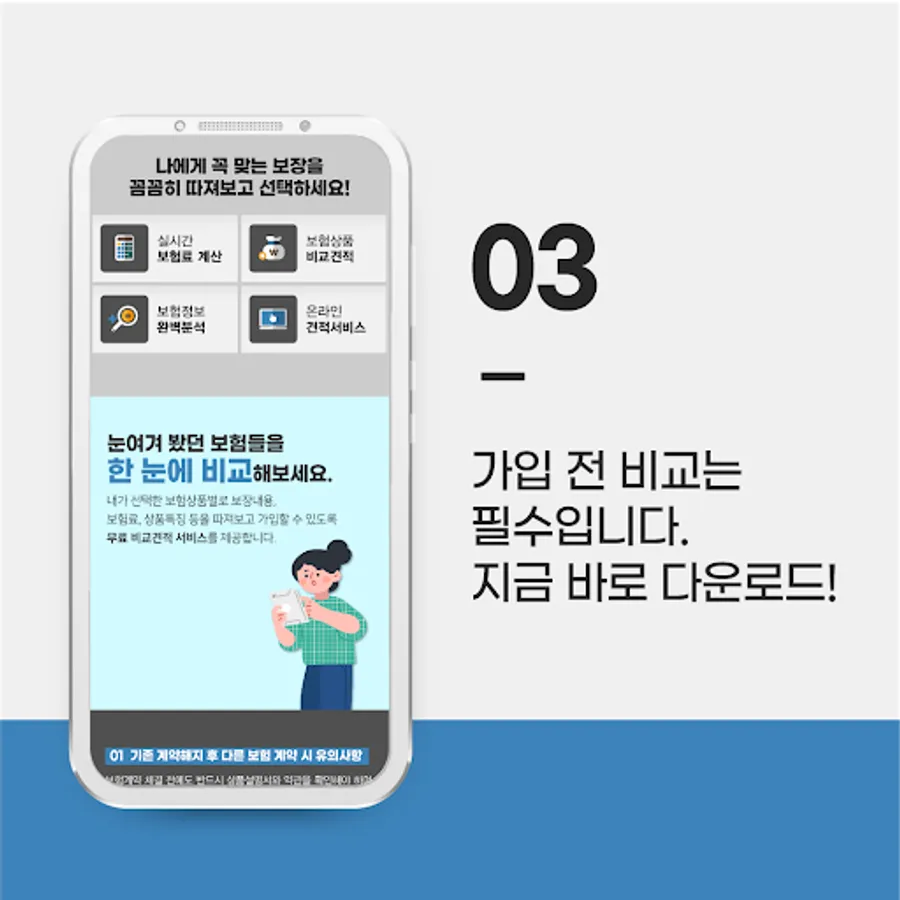 If you have a smartphone, you can check and compare actual insurance products from various domestic insurance companies at a glance with one click. Quickly and easily view my insurance premiums in real time and help you sign up for real life insurance at a low price through simple comparison.