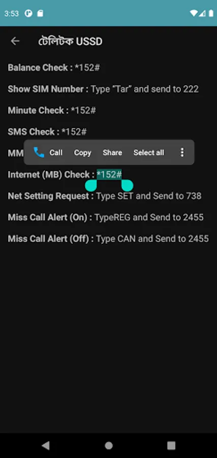 সিমের কোড গুলো কপি এবং সরাসরি ফোন কন্টাকে নিয়ে ডায়াল করা যায়