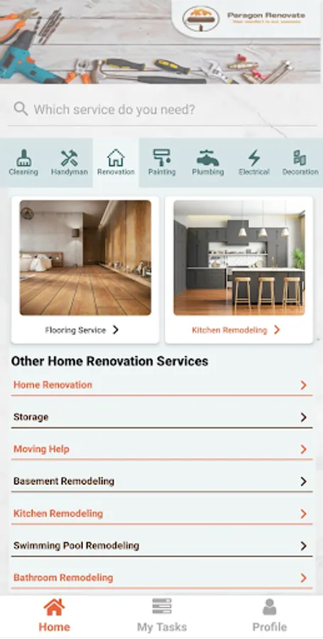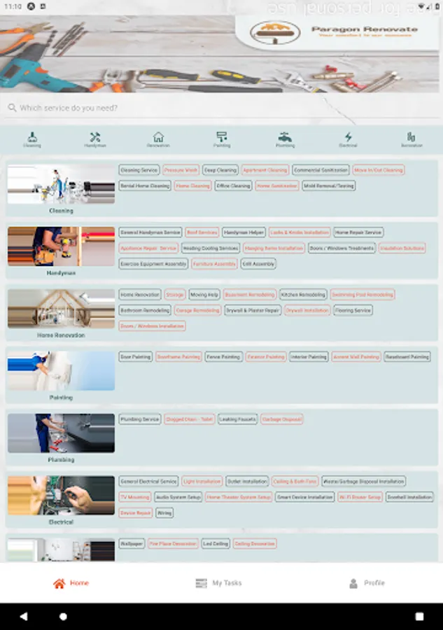 You can make an appointment to receive services from the categories of cleaning, handyman, renovation, painting, plumbing, electrical, and decoration with our application