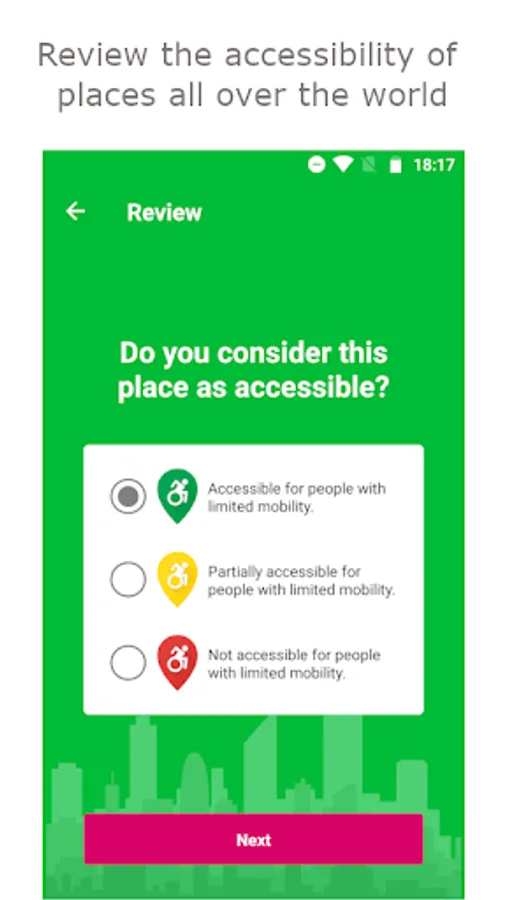 Rating takes at most 30 seconds. You choose between green, yellow or red pin color and answer quick and simple questions to give your opinion about a place's accessibility: