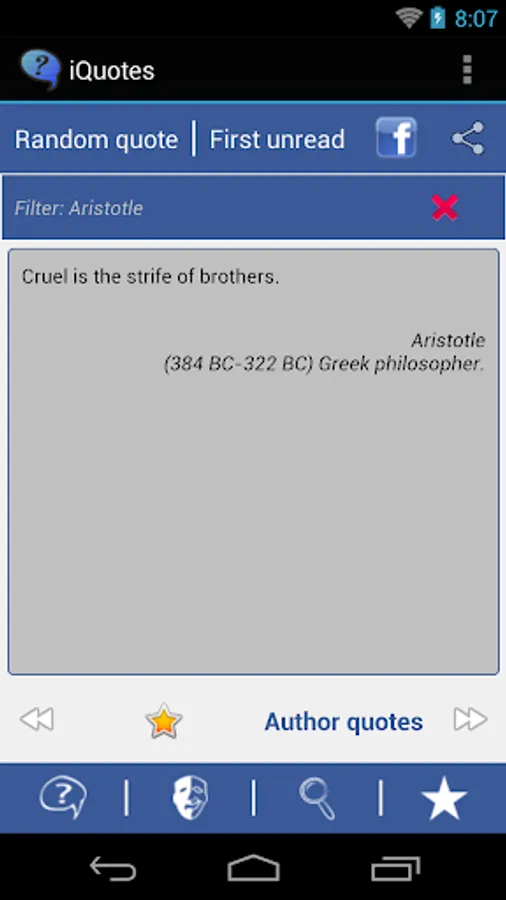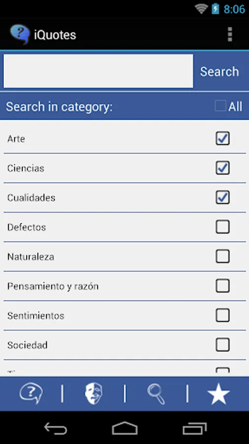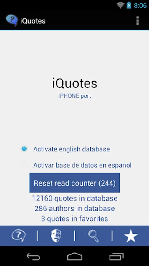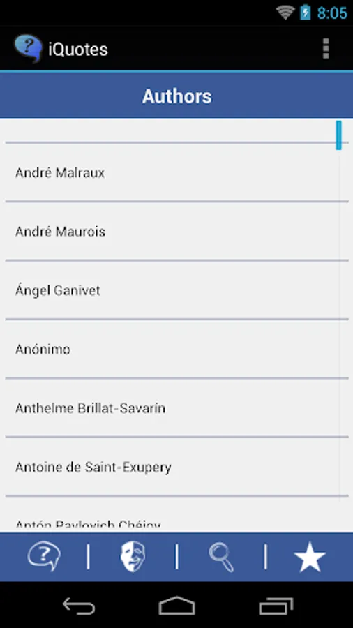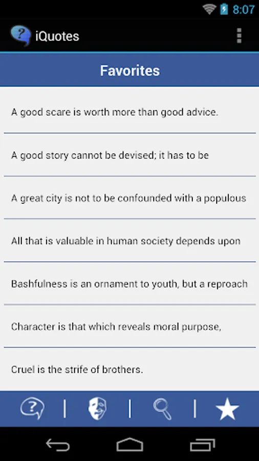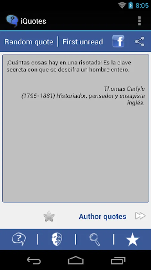 More than 18000 quotations of famous people, developed in English and Spanish. The application allows search for quotations, browse quotations by category or author and maintain a list of favorite quotes.