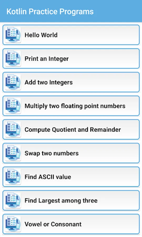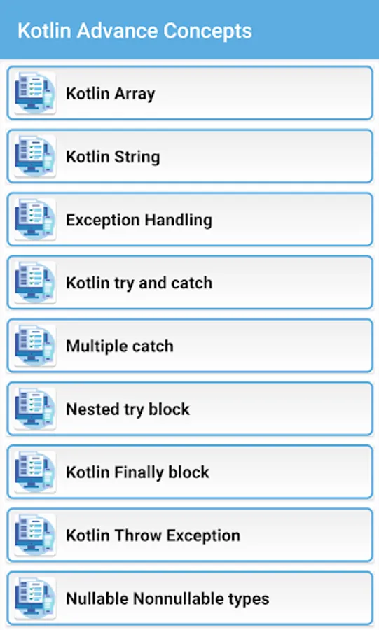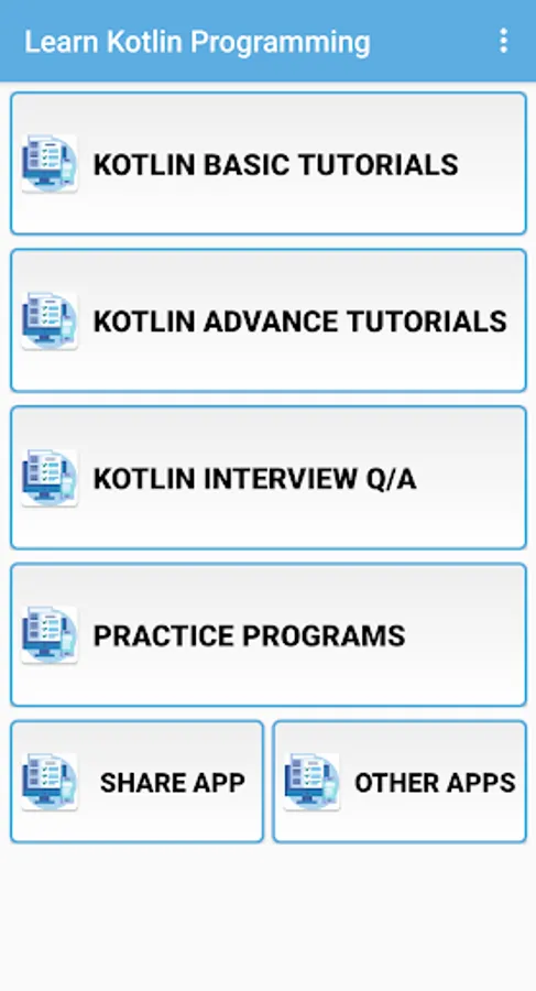 Learn Kotlin Programming Application is our sincere effort to help in Learning Kotlin Development. Content in the application are collected from the several Sources of Internet.
