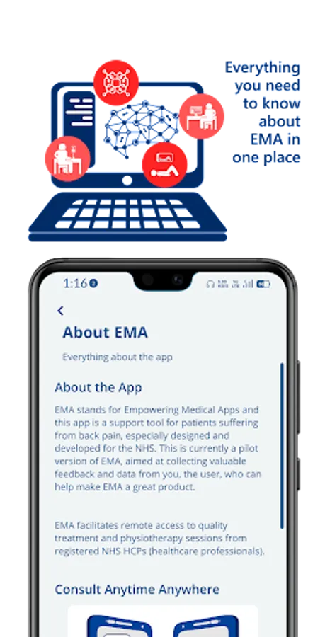 EMA is an AI-based application that works as a platform to assist patients suffering from back pain, and for clinicians treating them to provide care remotely. The features include exercise monitoring and video conferencing with HCPs and performance reports. EMA is fully GDPR/DSP compliant and is a cost-effective way to manage back pain and maintain proper posture. This Empowering Medical App seeks to enhance care for patients, and speed up the care that HCPs provide, moving the whole process forward more efficiently. EMA is a robust ecosystem, linking sufferers and carers end-to-end.