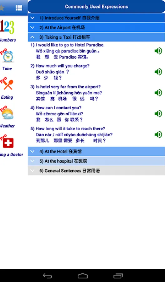 There is a special section made for frequent travellers to Chinese speaking nations - 'Commonly Used Expressions'. This section is absolutely free and has sentences that are used in day-to-day communication. It has 6 sections -