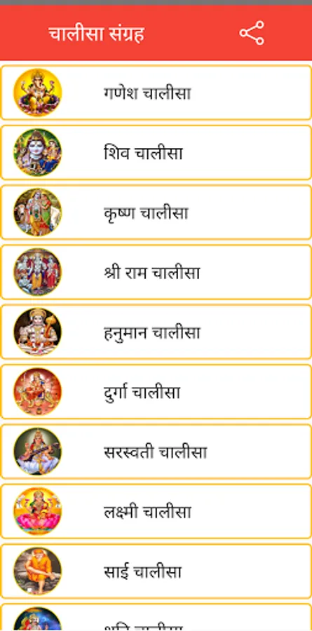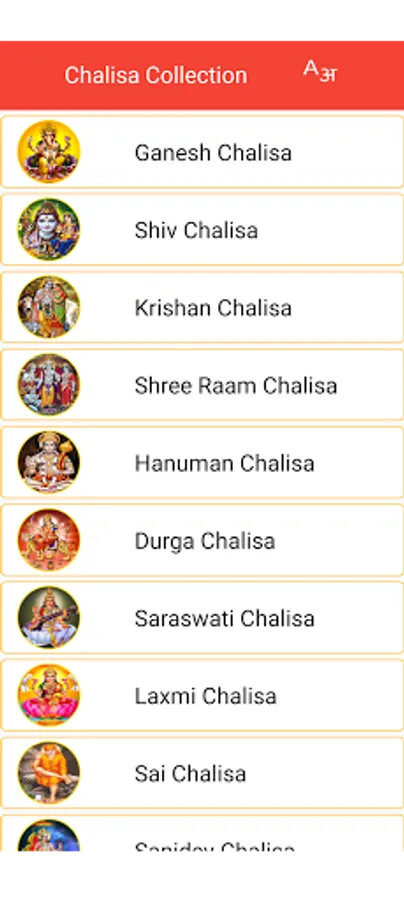 जैसे की: राम , हनुमान , गणेश , शिव , कृष्ण , माता दुर्गा, शनि , साई आदी सभी की चालीसा दी गई है.