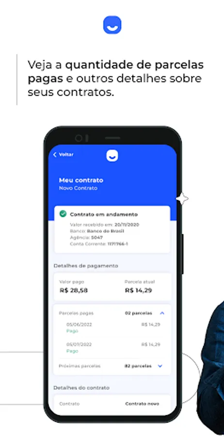 • No queues, no delay: track the status of your payroll loan proposals in a simple and secure way, in real time. Check the number of installments paid, as well as other details about your approved proposals and contracts.