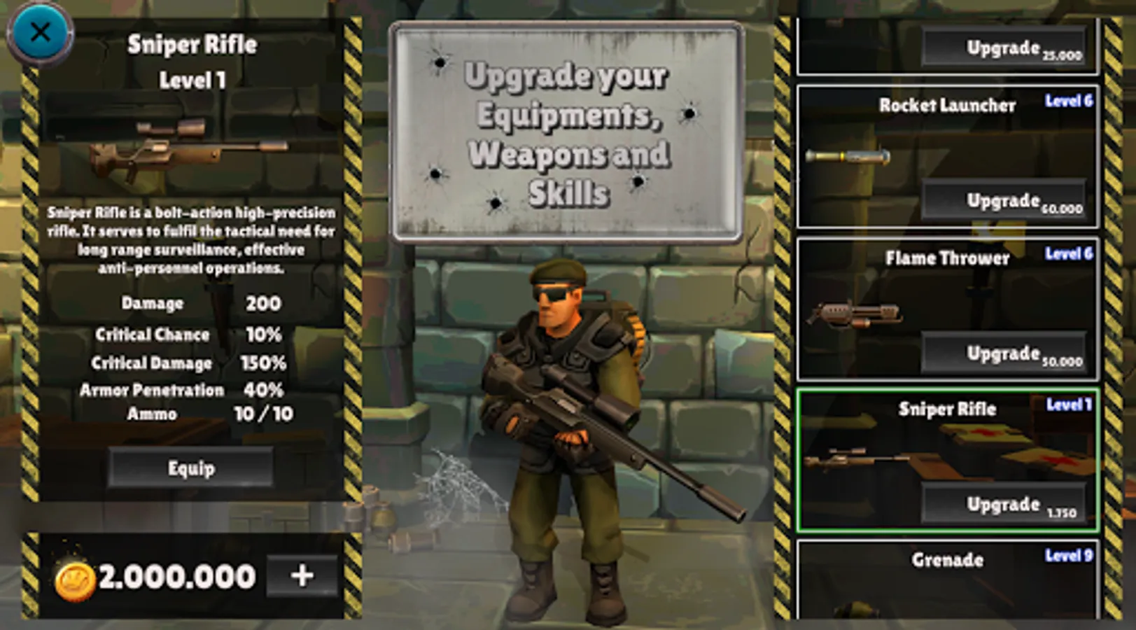You can upgrade your skills. There are 4 upgradable skills: Bodybuilding, Anatomy, Chem, Luck that will make you a super soldier. Not even the baddest ex black ops operatives can defeat you now. There are also 8 different weapons that you can use and upgrade.