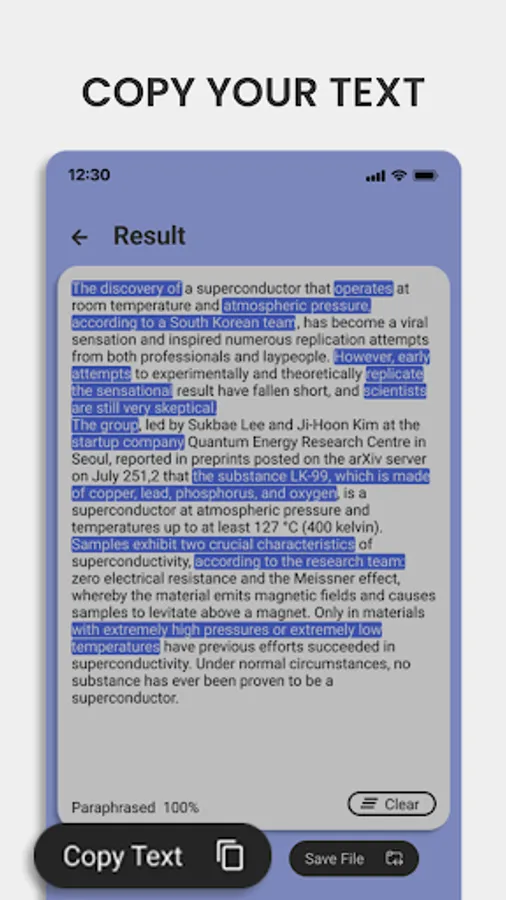 Plagiarism Fixer checks for duplicate content. Simply copy and paste your content into the app, and it will automatically detect any plagiarized passages. Then, Plagiarism Fixer will rewrite those passages using synonyms, rephrasing, and other techniques to create completely original content.