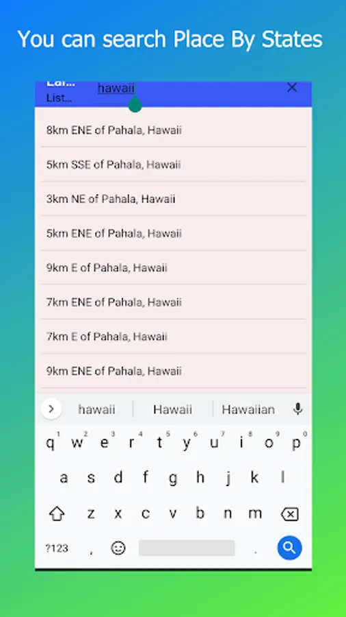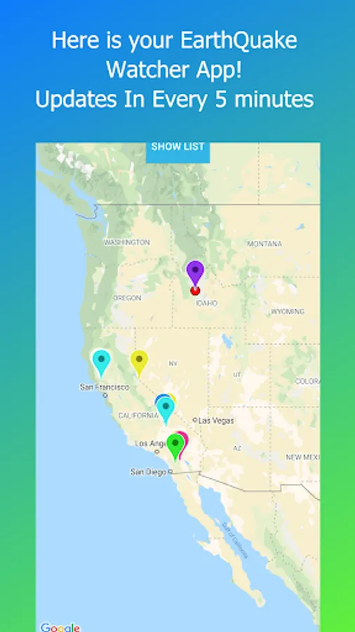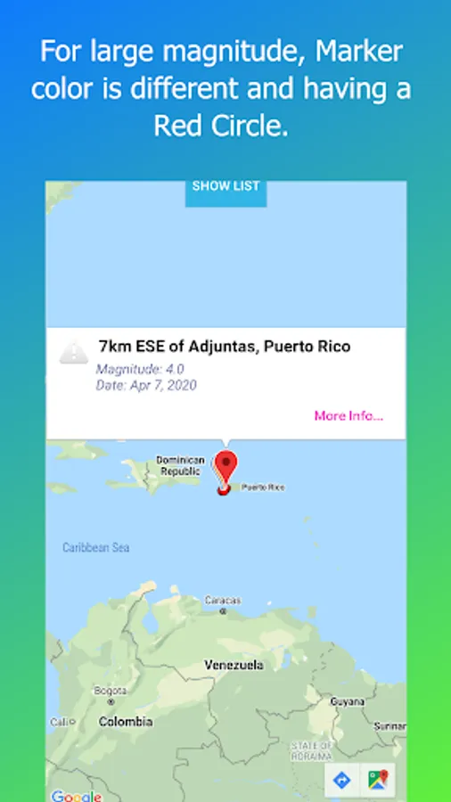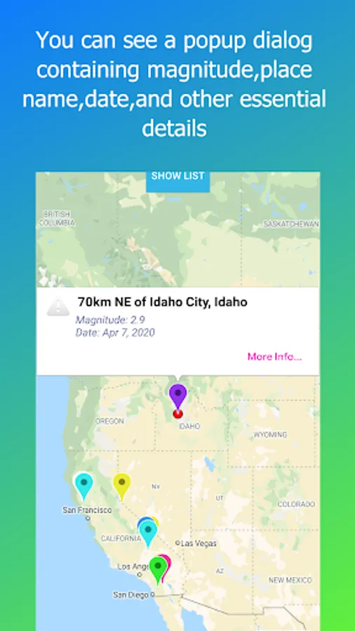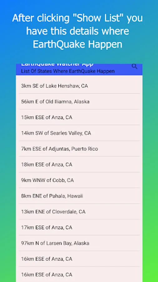 - It contains a button(Show List) that displays all the states/places where an earthquake happens with more details.