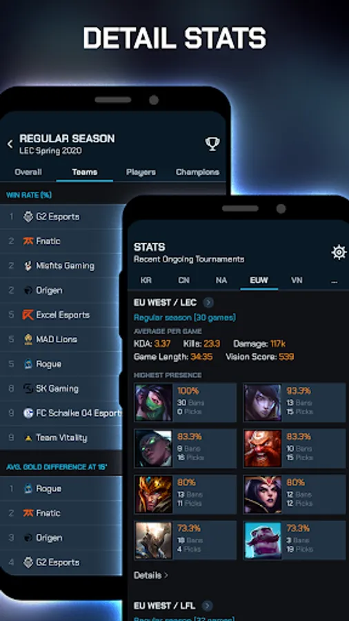 * Teams stats: Win rate, average gold lead, first blood rate, objectives control rate, ...