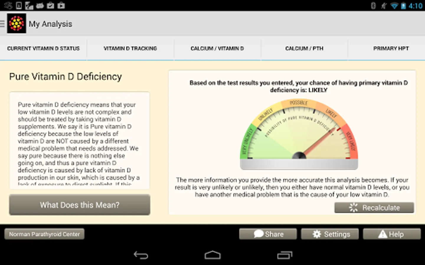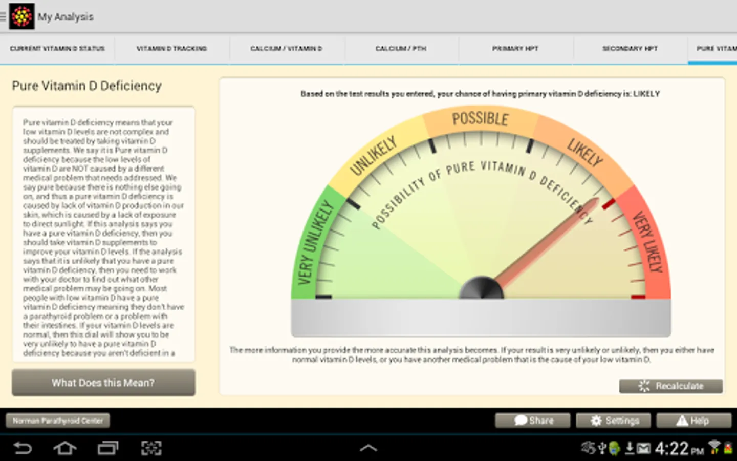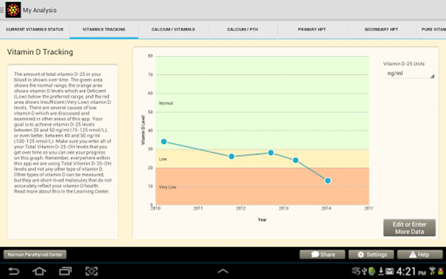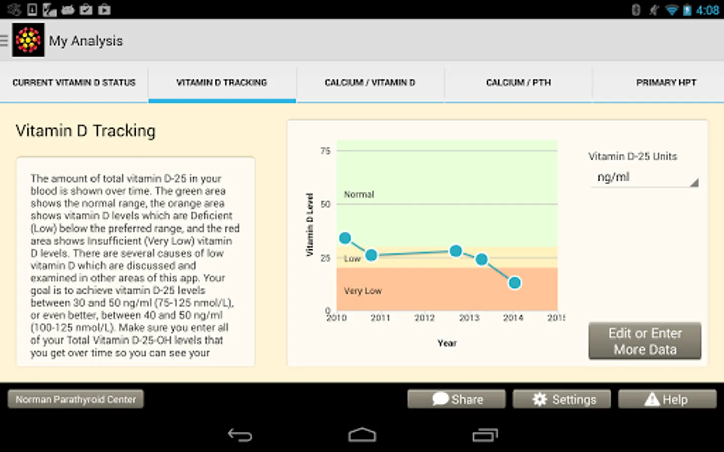 The app was designed to be used by patients, but many doctors use it in their practice as well. Easy to use data entry forms result in beautiful graphs that make complex medical issues easy to understand and decisions about how to move forward easy. The Learning Library has easy to read articles written by expert doctors. The store will make specific vitamin D and calcium recommendations for you based upon your blood tests and analysis. Almost all users of the app will understand vitamin D problems better than their doctors, but it will help you discuss these issues with your doctors so you can come up the perfect plan for you. We will help you and your doctor take the guess work out of vitamin D and calcium problems.