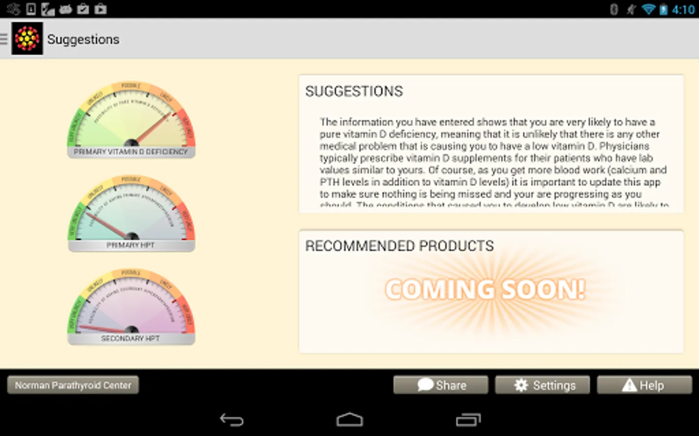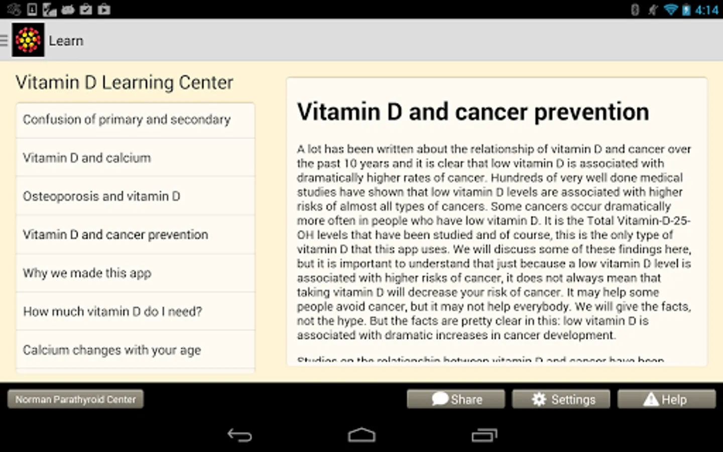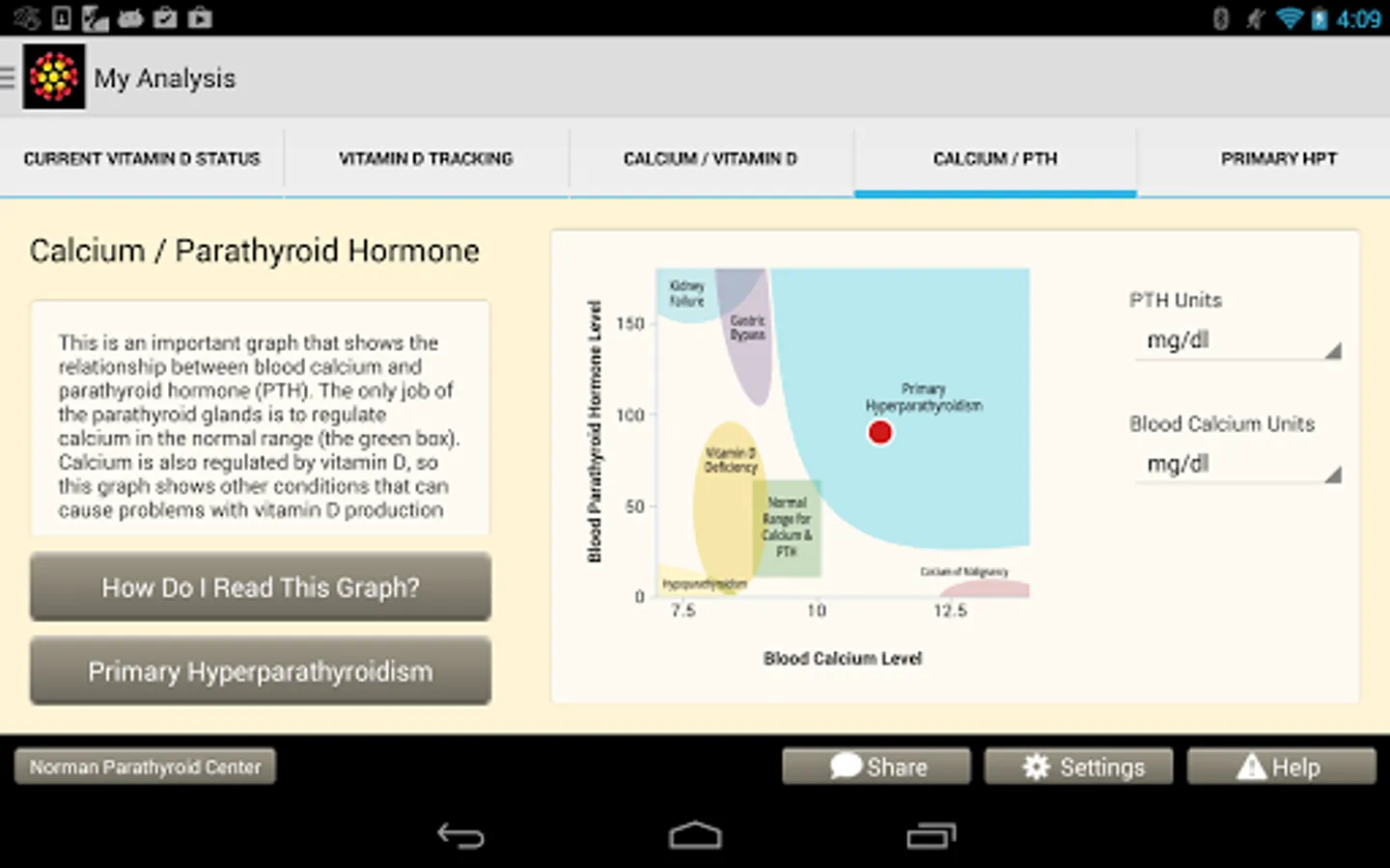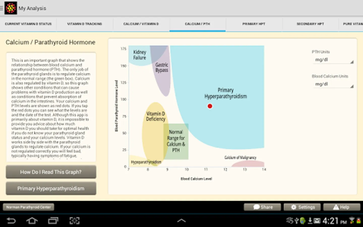 The app was designed to be used by patients, but many doctors use it in their practice as well. Easy to use data entry forms result in beautiful graphs that make complex medical issues easy to understand and decisions about how to move forward easy. The Learning Library has easy to read articles written by expert doctors. The store will make specific vitamin D and calcium recommendations for you based upon your blood tests and analysis. Almost all users of the app will understand vitamin D problems better than their doctors, but it will help you discuss these issues with your doctors so you can come up the perfect plan for you. We will help you and your doctor take the guess work out of vitamin D and calcium problems.