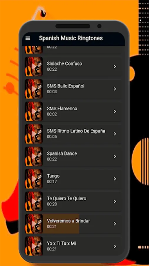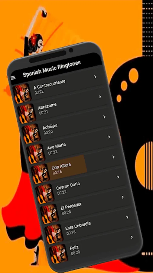 In this application you can find different types of Spanish music ringtones such as: Traditional tones, pop, reggaeton, Flamenco, copla, fandango, malagueñas, polka, contrapás, happy Spanish rhythms, religious, urban, Instrumental, Popular, bachata, romantic, rock, Ballads, rap, hip hop, old and new sounds of 2023 for free.